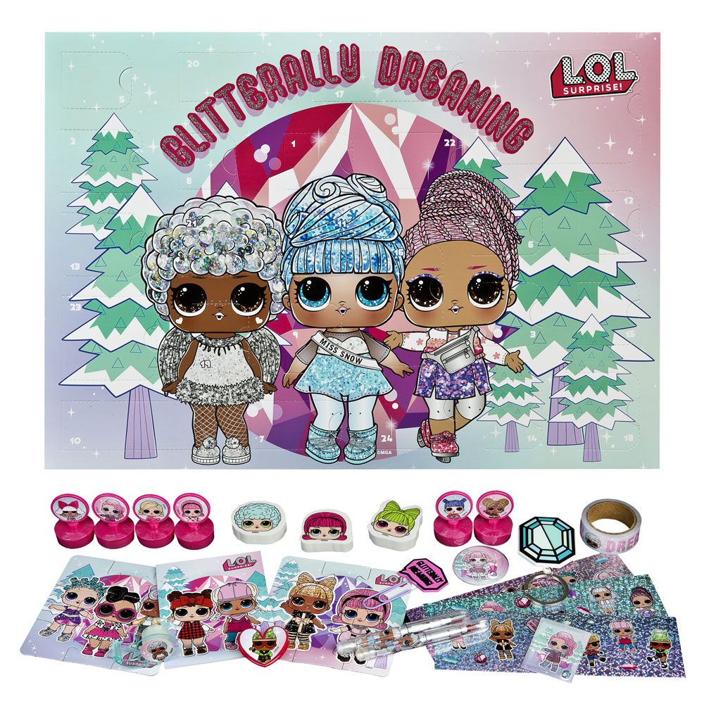 Dětský adventní kalendář bez čokolády obsahuje 24 drobností, které dětem zkrátí čekání na Štědrý den. Sada s motivem LOL Surprise obsahuje: