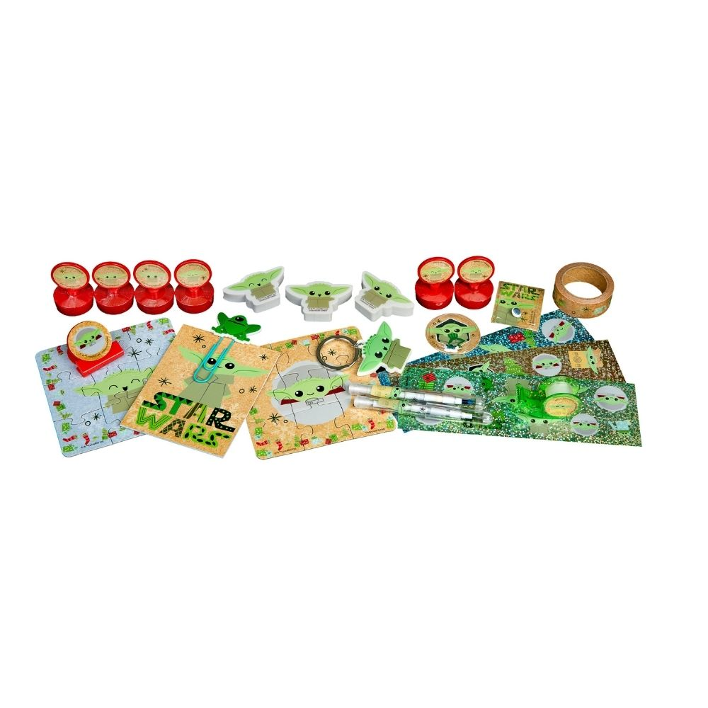 Dětský adventní kalendář bez čokolády obsahuje 24 drobností, které dětem zkrátí čekání na Štědrý den. Sada s motivem Star Wars The Child obsahuje: