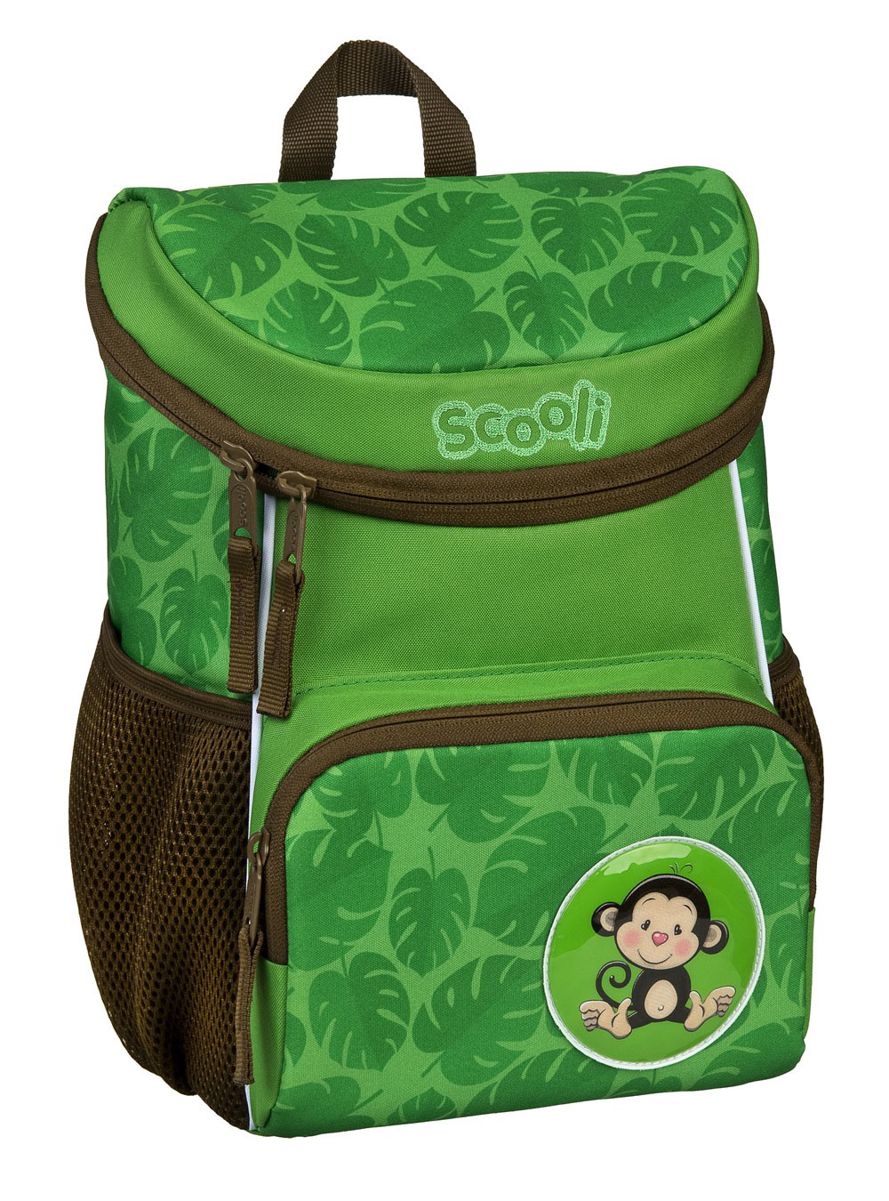 Roztomilý předškolní batoh Scooli s motivem opičky vhodný pro děti od 3 let na výlety či do školky. Batoh se skládá z hlavní prostorné kapsy a přední menší kapsičky, kam pohodlně umístíte obědovou krabičku, láhev na pití a veškeré další drobnosti.