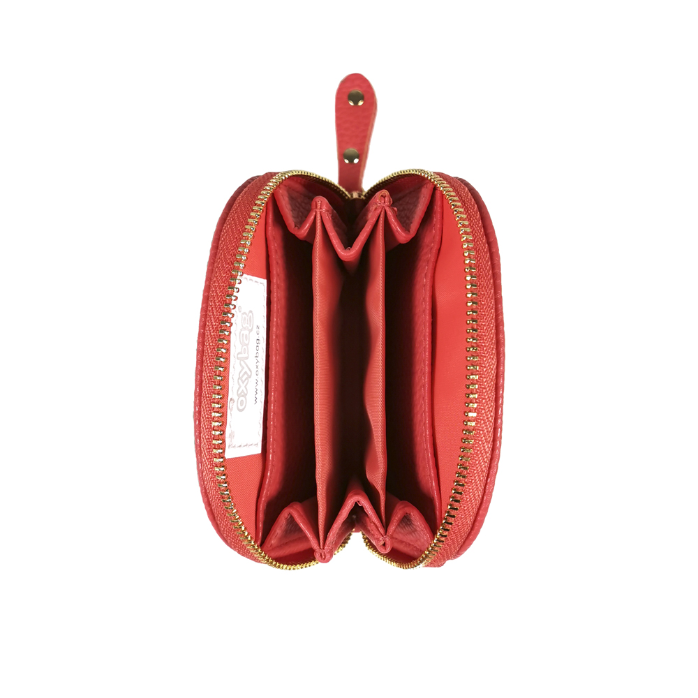 Malá dámská peněženka v korálovém provedení. Hlavní zipová kapsa má uvnitř 5 oddělených přihrádek na mince a karty.