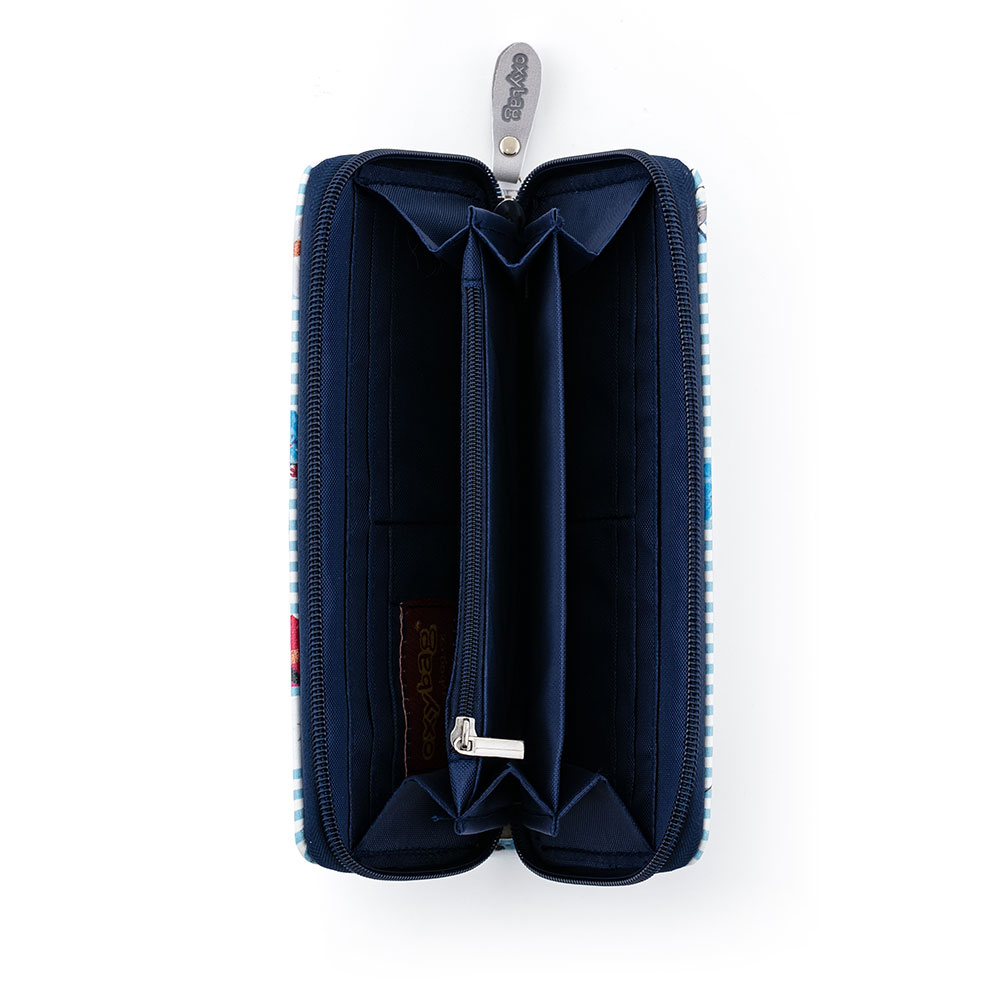 Velká dámská peněženka v květinovém motivu. Uvnitř je 8 menších kapes na věrnostní karty, 2 větší kapsy, 3 oddělené přihrádky na hotovost a 1 uzavíratelná kapsa na zip na drobné mince.