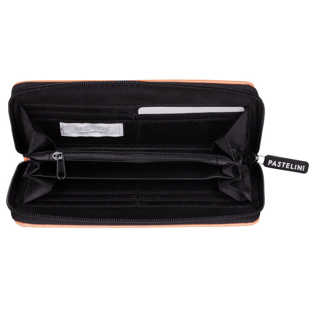 Velká dámská peněženka v oranžovém provedení. Uvnitř je 8 menších kapes na věrnostní karty, 2 větší kapsy, 3 oddělené přihrádky na hotovost a 1 uzavíratelná kapsa na zip na drobné mince.