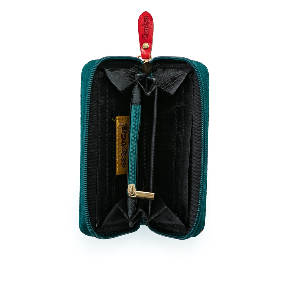 Small purse in polka-dot design. Inside, there are 6 smaller loyalty card pockets, 3 separate cash drawers and 1 closable zipper pocket for small coins.