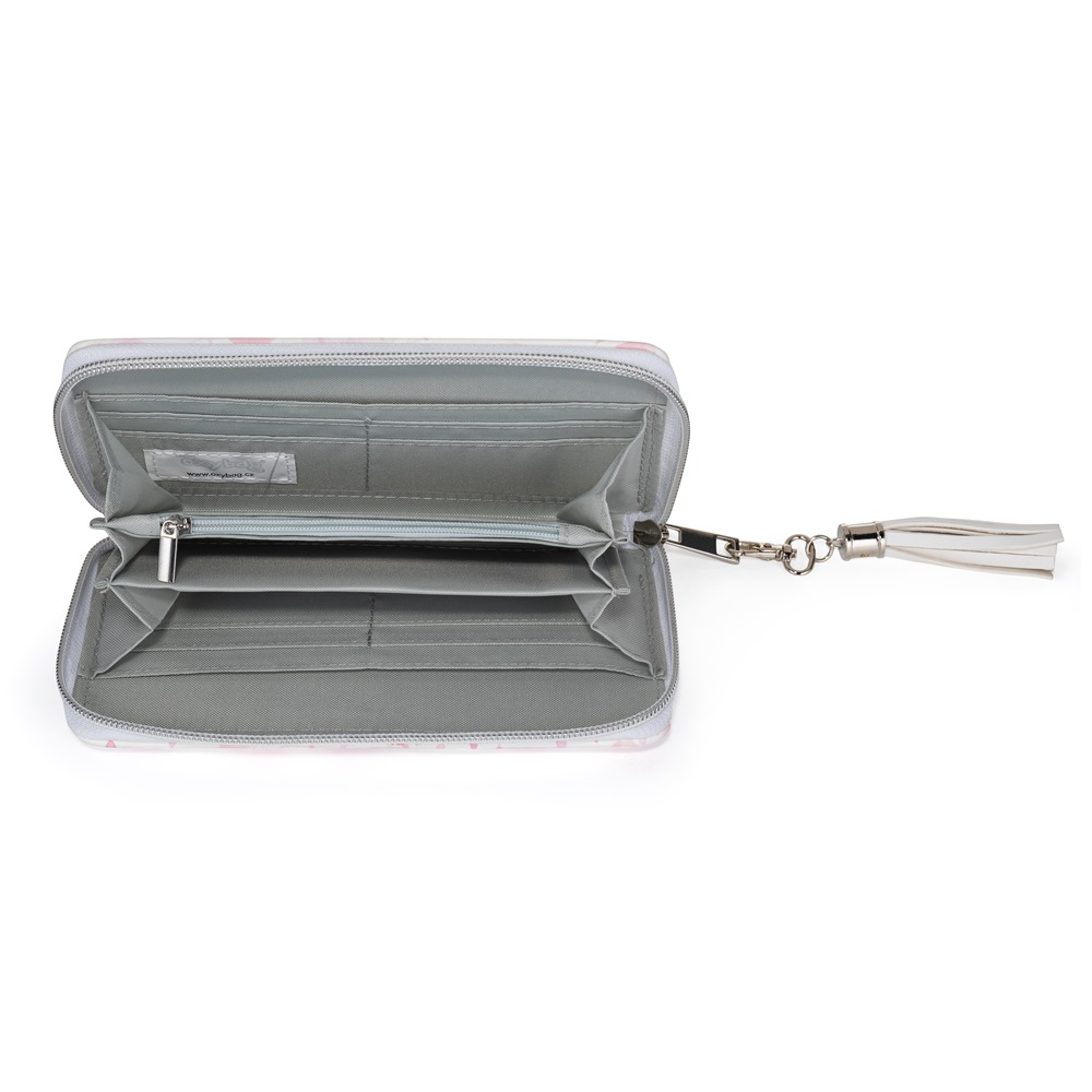 Large purse in floral design. Inside, there are 8 smaller loyalty card pockets, 2 larger pockets, 3 separate cash drawers and 1 closable zipper pocket for small coins.