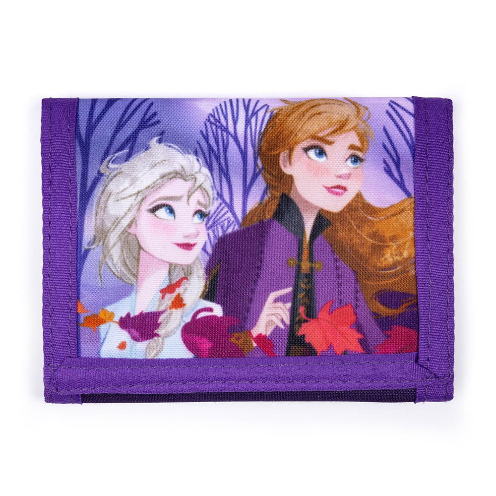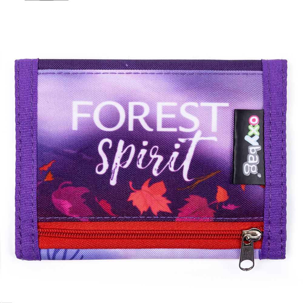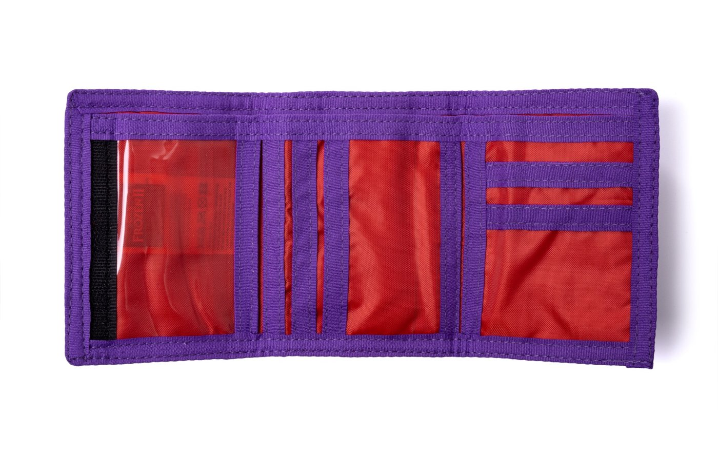 Practical textile velcro wallet. At the back there is a zipper pocket for coins, inside one compartment for banknotes, six pockets for cards and one transparent pocket.