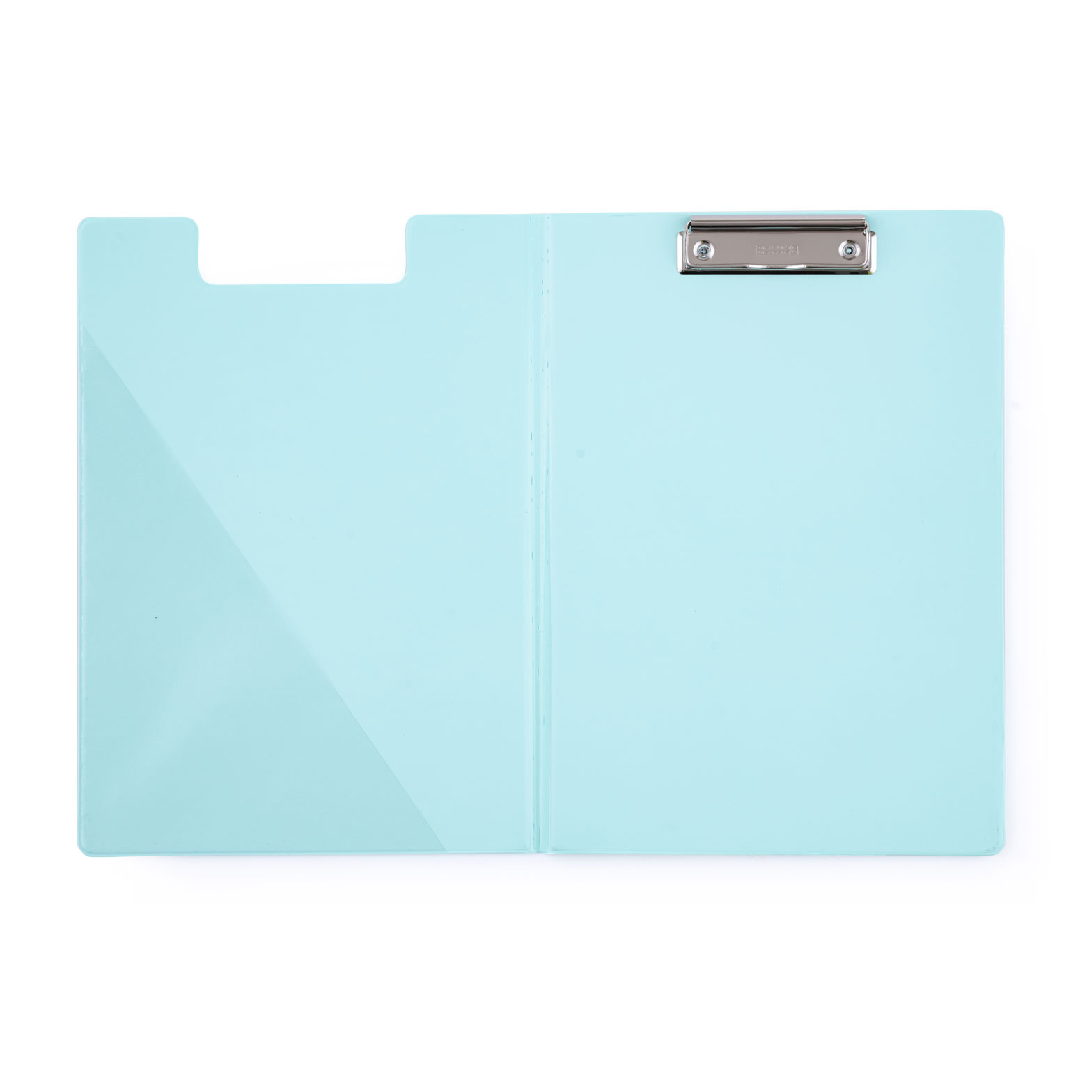 Plastová psací podložka v moderních pastelových barvách, rozevírací s kovovým klipem na dokumenty A4. Extra pevná lepenka potažená plastem.
