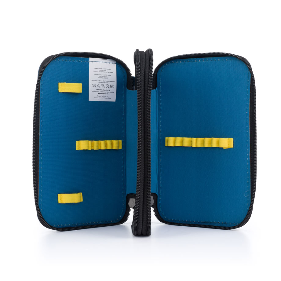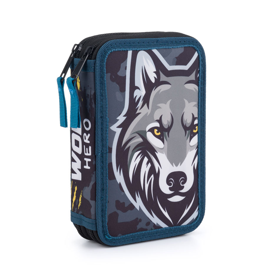 School pencil case two zippers empty in wolf design. The pencil case contains 25 rubber loops for storing all the pens and pencils and small items needed for school lectures. The pencil case has a solid zipper with large drawstrings for easy handling. One floor has a transparent compartment for weekly schedule.