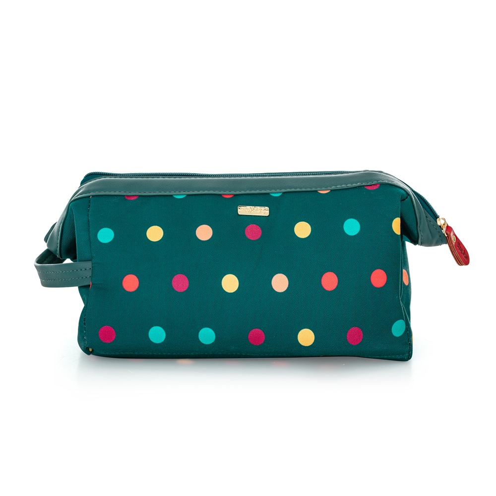 Big cosmetic bag in polka-dot design. Suitable for storing toiletry and travel sized cosmetics.