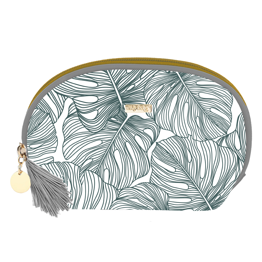 Cestovní kulatá kosmetická taška v šedobílém provedení. Vhodná k uskladnění toaletních a kosmetických potřeb menší velikosti.