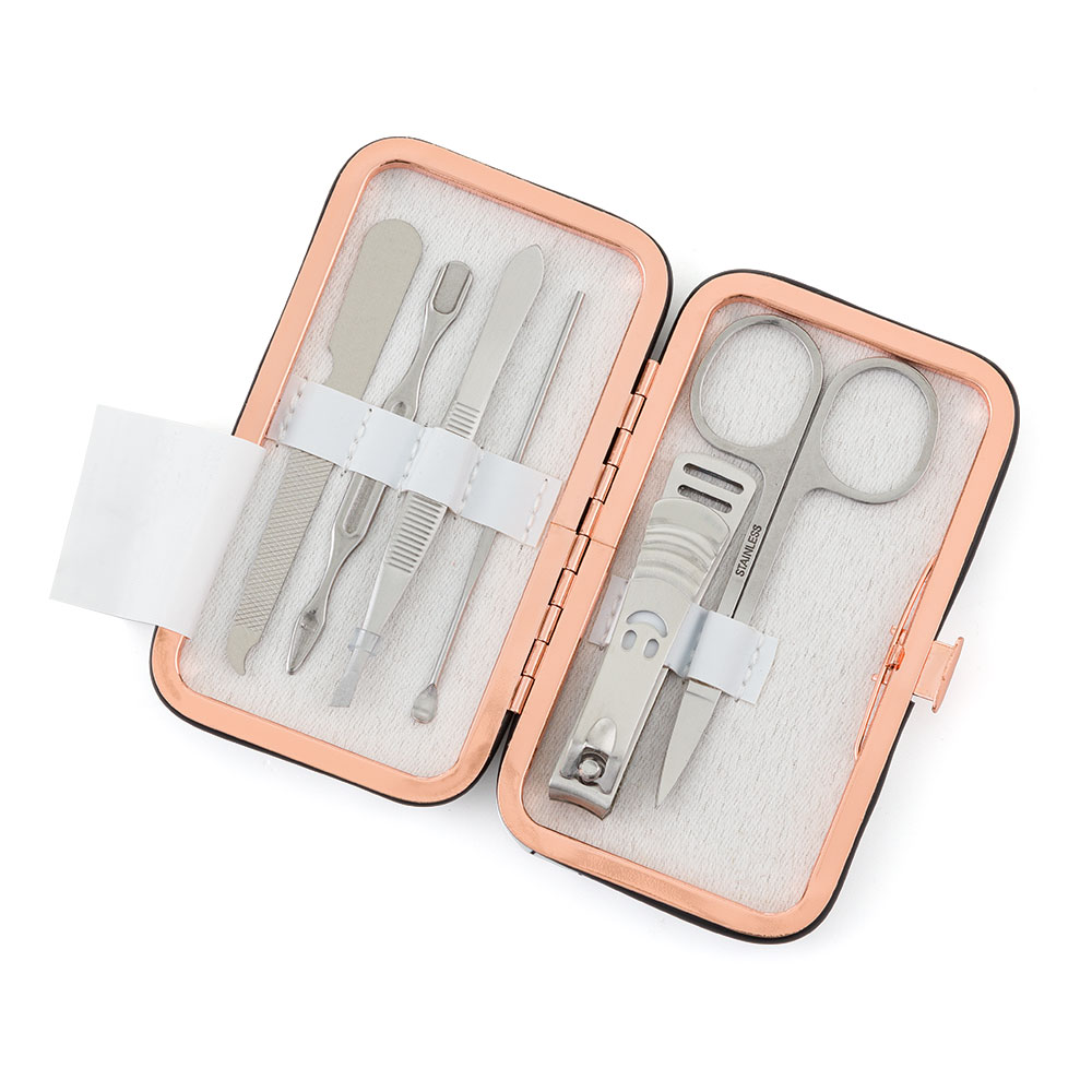 Cestovní manikúrní set 6 ks v černobílém provedení. Stříbrná sada obsahuje nůžky, kleštičky na nehty, zkosenou pinzetu, pilník, manikúrní tyčinku a zatlačovač kůžičky. Ideální velikost do kabelky či na cesty.