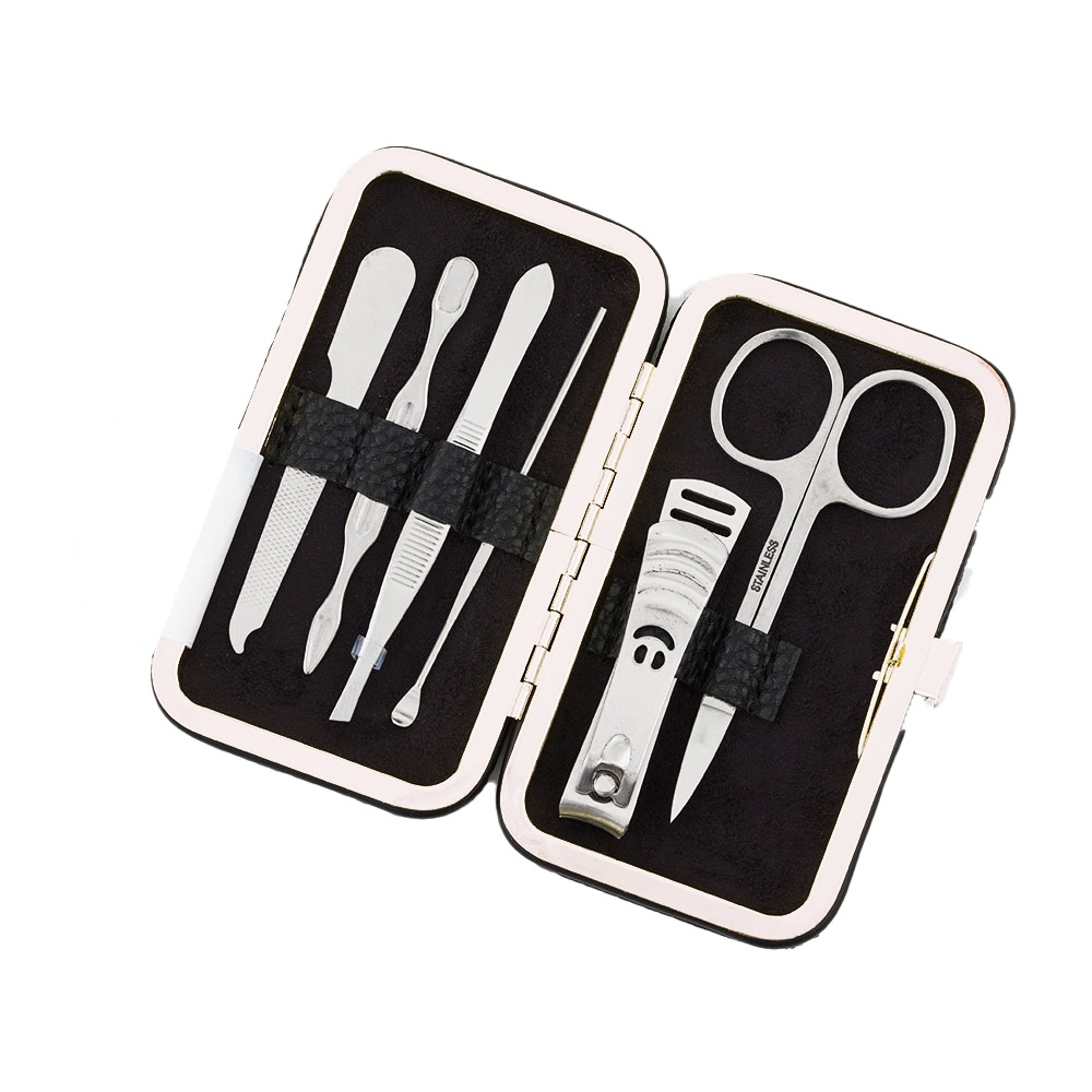 Cestovní manikúrní set 6 ks v černém provedení. Stříbrná sada obsahuje nůžky, kleštičky na nehty, zkosenou pinzetu, pilník, manikúrní tyčinku a zatlačovač kůžičky. Ideální velikost do kabelky či na cesty.