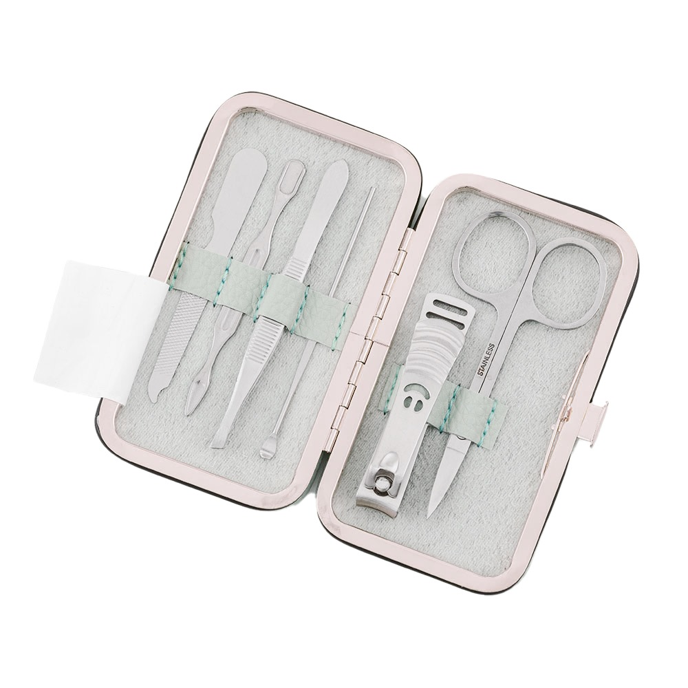 Cestovní manikúrní set 6 ks v zeleném provedení. Stříbrná sada obsahuje nůžky, kleštičky na nehty, zkosenou pinzetu, pilník, manikúrní tyčinku a zatlačovač kůžičky. Ideální velikost do kabelky či na cesty.