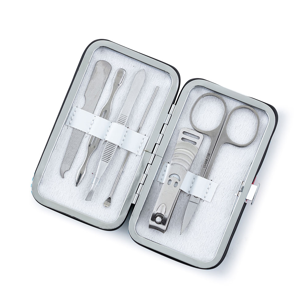 Cestovní manikúrní set 6 ks v květinovém provedení. Stříbrná sada obsahuje nůžky, kleštičky na nehty, zkosenou pinzetu, pilník, manikúrní tyčinku a zatlačovač kůžičky. Ideální velikost do kabelky či na cesty.