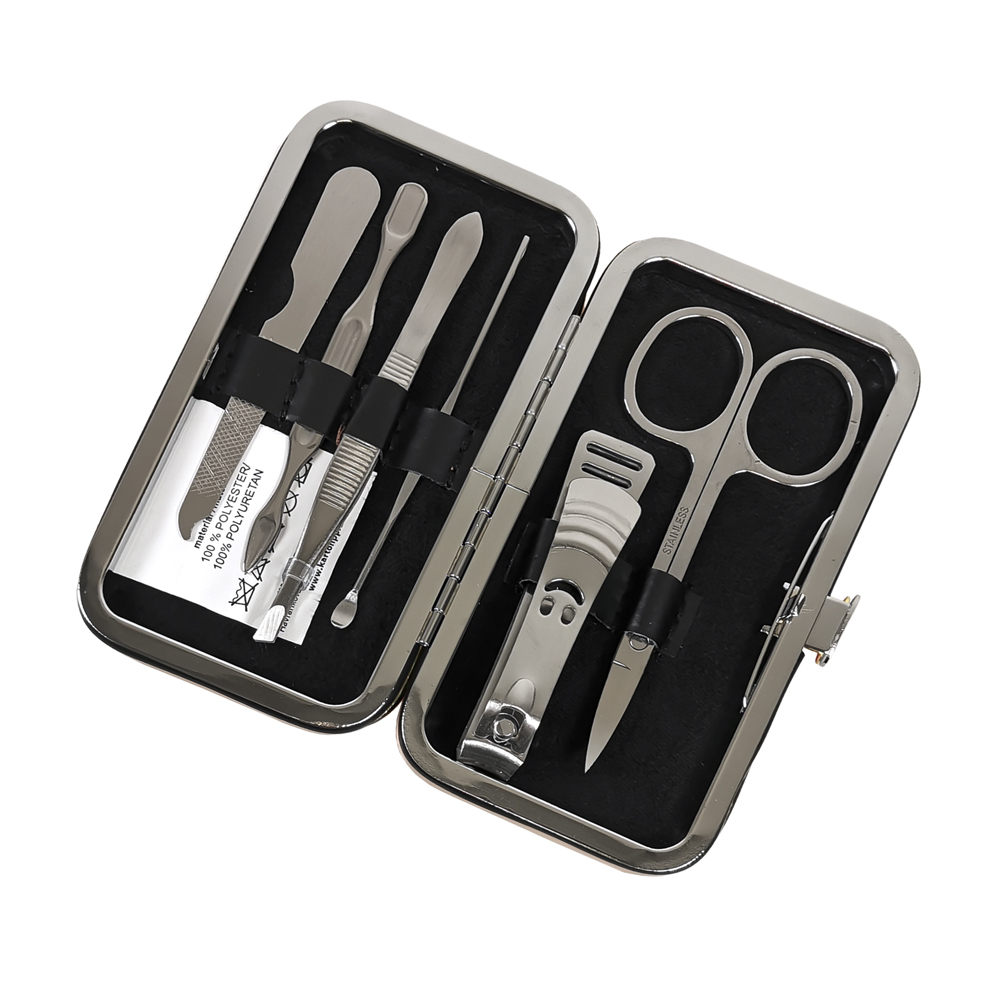 Cestovní manikúrní set 6 ks v oranžovém provedení. Stříbrná sada obsahuje nůžky, kleštičky na nehty, zkosenou pinzetu, pilník, manikúrní tyčinku a zatlačovač kůžičky. Ideální velikost do kabelky či na cesty.