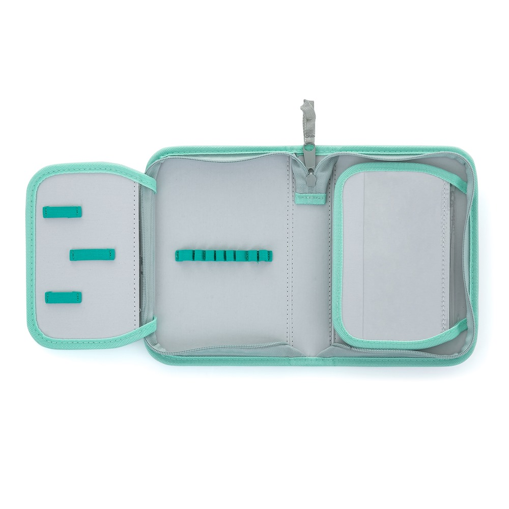 One-storey empty glitter pencil case with 2 flaps contains 25 rubber loops for storing stationery. On the inner flaps are transparent foils for the timetable.