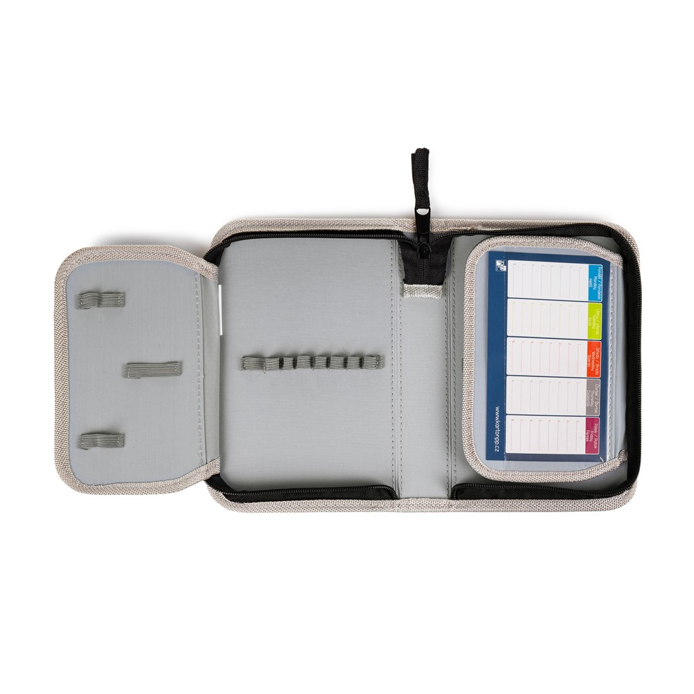 One-storey empty pencil case with 2 flaps contains 25 rubber loops for storing stationery. On the inner flaps are transparent foils for the timetable.