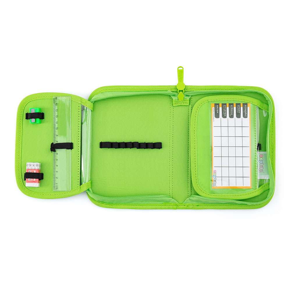 Jednopatrový školní penál se 2 chlopněmi, prázdný obsahuje 25 gumových poutek pro uchycení psacích potřeb. Na vnitřních chlopních jsou průhledné fólie pro rozvrh hodin.