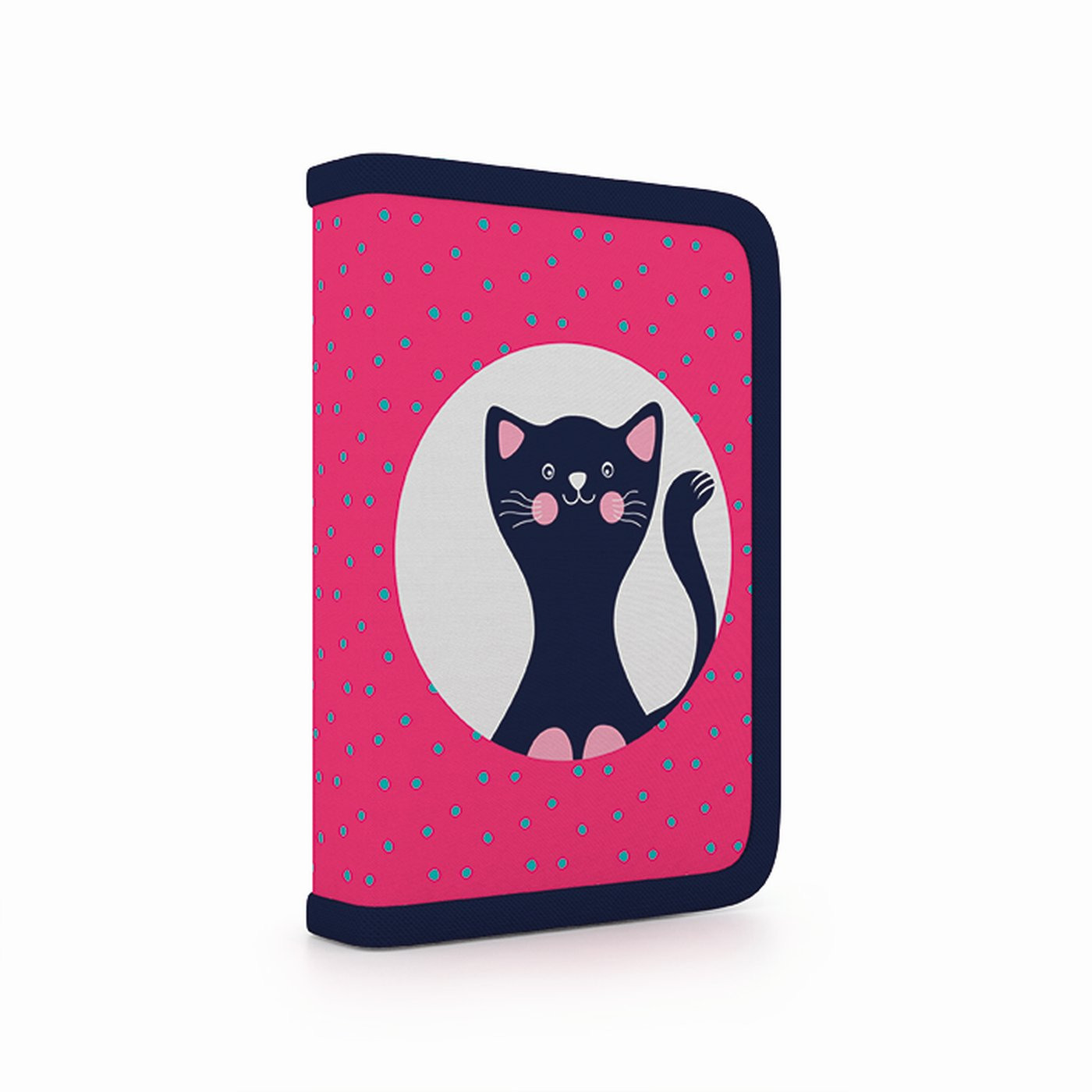 School pencil case in cat motif. Filled pencil case contains quality school supplies of Centropen and Staedtler brands: triangular crayons 6 pcs, felt-tip pens 8 pcs, pencils 2 pcs, eraser, sharpener, ruler 12 cm, timetable.