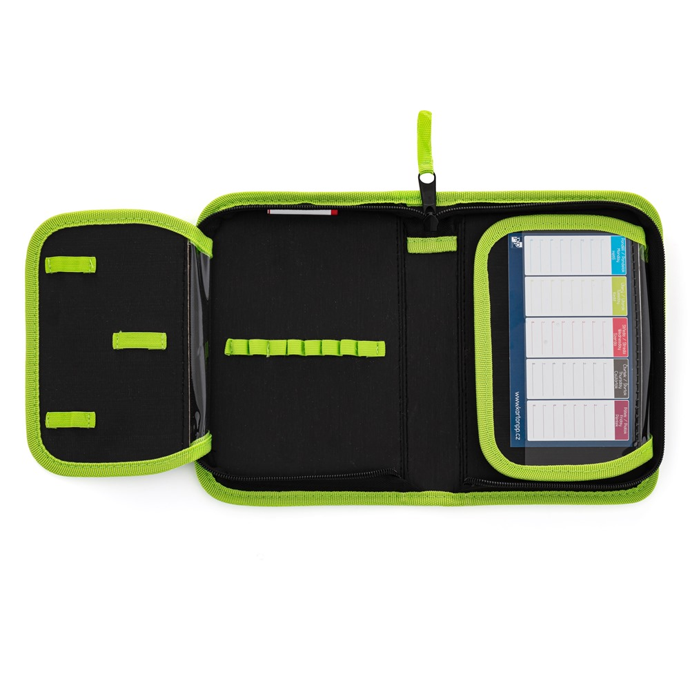 One-storey empty pencil case with 2 flaps contains 25 rubber loops for storing stationery. On the inner flaps are transparent foils for the timetable.