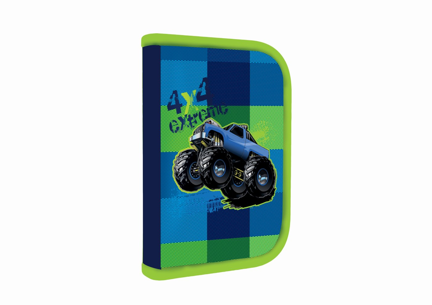School pencil case in Truck motif. Filled pencil case contains quality school supplies of Centropen and Staedtler brands: triangular crayons 6 pcs, felt-tip pens 8 pcs, pencils 2 pcs, eraser, sharpener, ruler 12 cm, timetable.