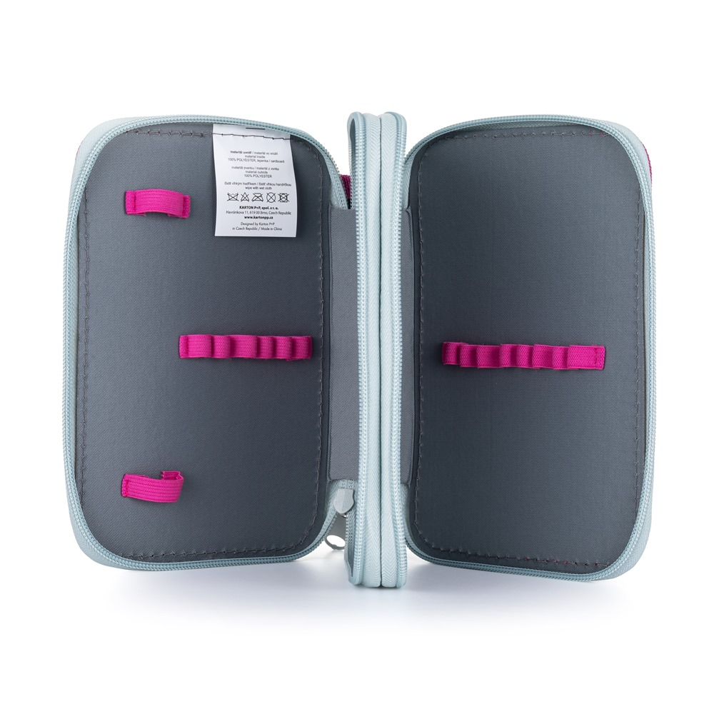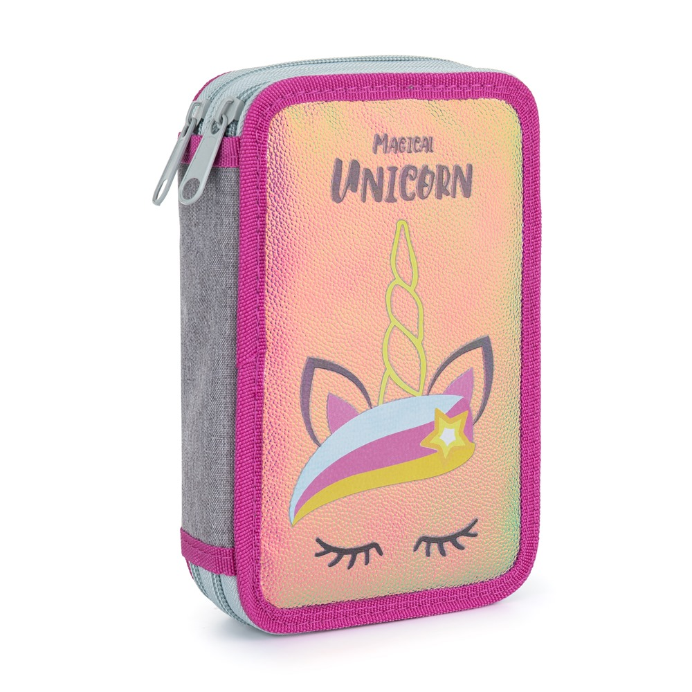 School pencil case two zippers empty in unicorn design. The pencil case contains 25 rubber loops for storing all the pens and pencils and small items needed for school lectures. The pencil case has a solid zipper with large drawstrings for easy handling. One floor has a transparent compartment for weekly schedule.