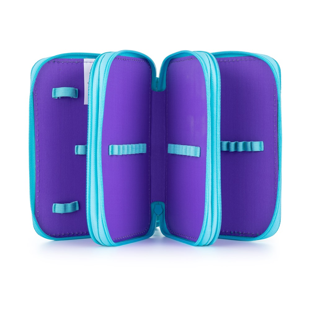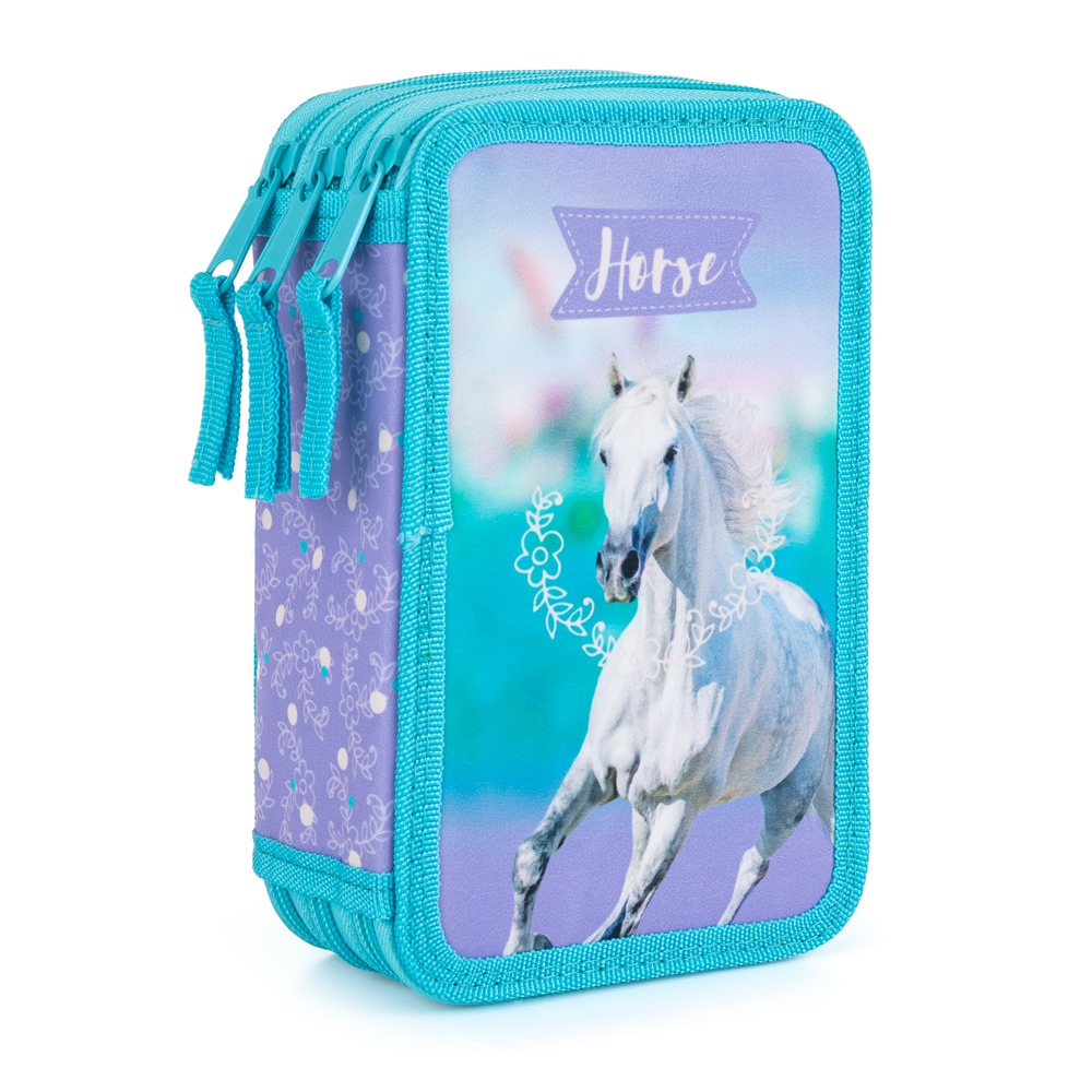 School pencil case three zippers empty in horse design. The pencil case contains 40 rubber loops for storing all the pens and pencils and small items needed for school lectures. The pencil case has a solid zipper with large drawstrings for easy handling. One floor has a transparent compartment for weekly schedule.