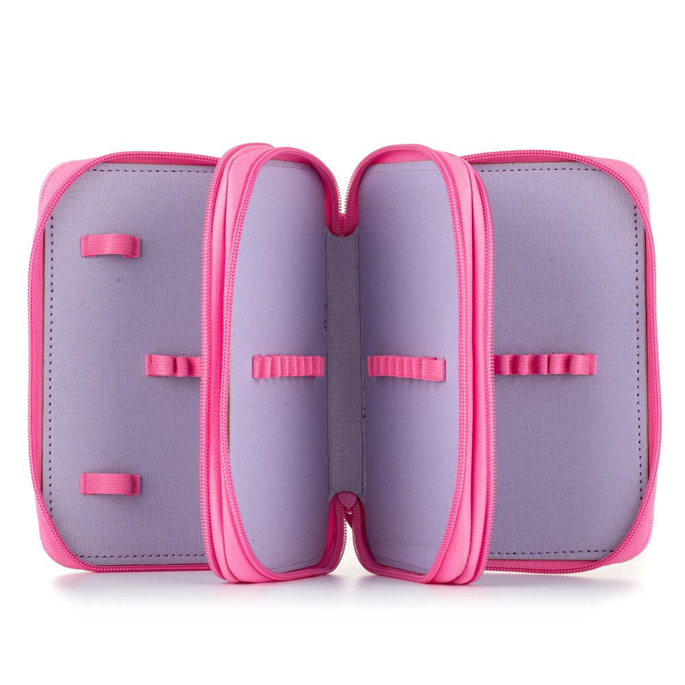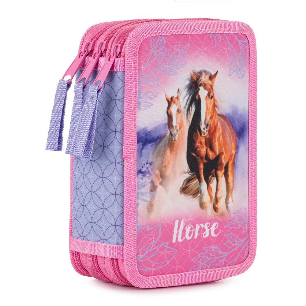 School pencil case three zippers empty in horse design. The pencil case contains 40 rubber loops for storing all the pens and pencils and small items needed for school lectures. The pencil case has a solid zipper with large drawstrings for easy handling. One floor has a transparent compartment for weekly schedule.