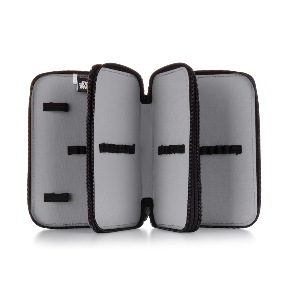 School pencil case three zippers empty in Star Wars design. The pencil case contains 40 rubber loops for storing all the pens and pencils and small items needed for school lectures. The pencil case has a solid zipper with large drawstrings for easy handling. One floor has a transparent compartment for weekly schedule.
