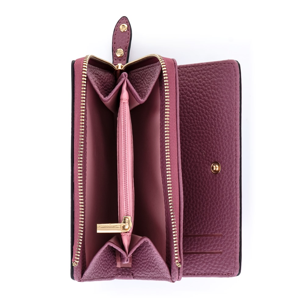 Menší dámská peněženka v růžovém provedení. Uvnitř je 10 menších kapes na věrnostní karty, 1 větší kapsa, 1 oddělená přihrádka na hotovost a oddělená uzavíratelná kapsa na zip na drobné mince.