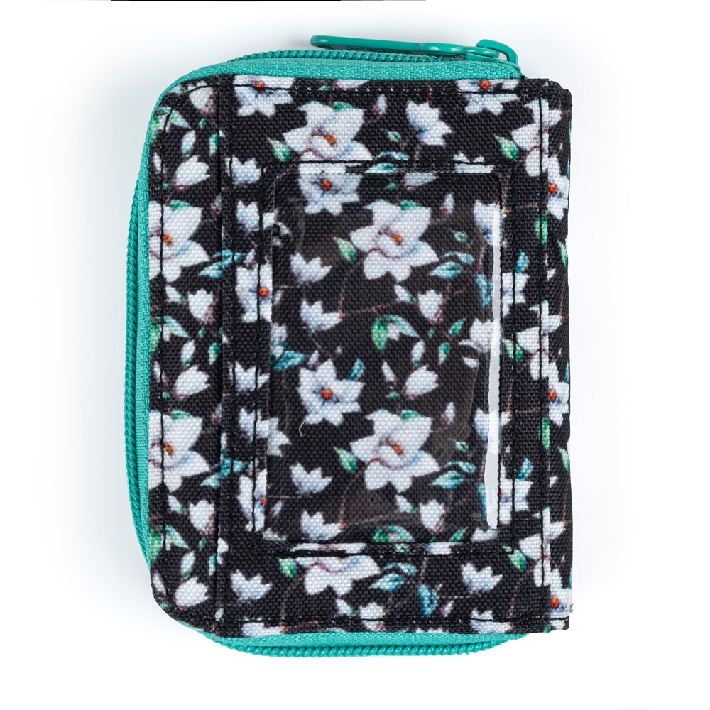 Student textile wallet with snap closure. At the back there is a transparent pocket for student card, inside one compartment for banknotes (without zipper), six pockets for cards and one zipper pocket for coins.