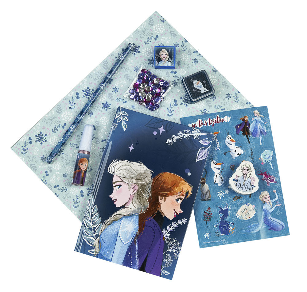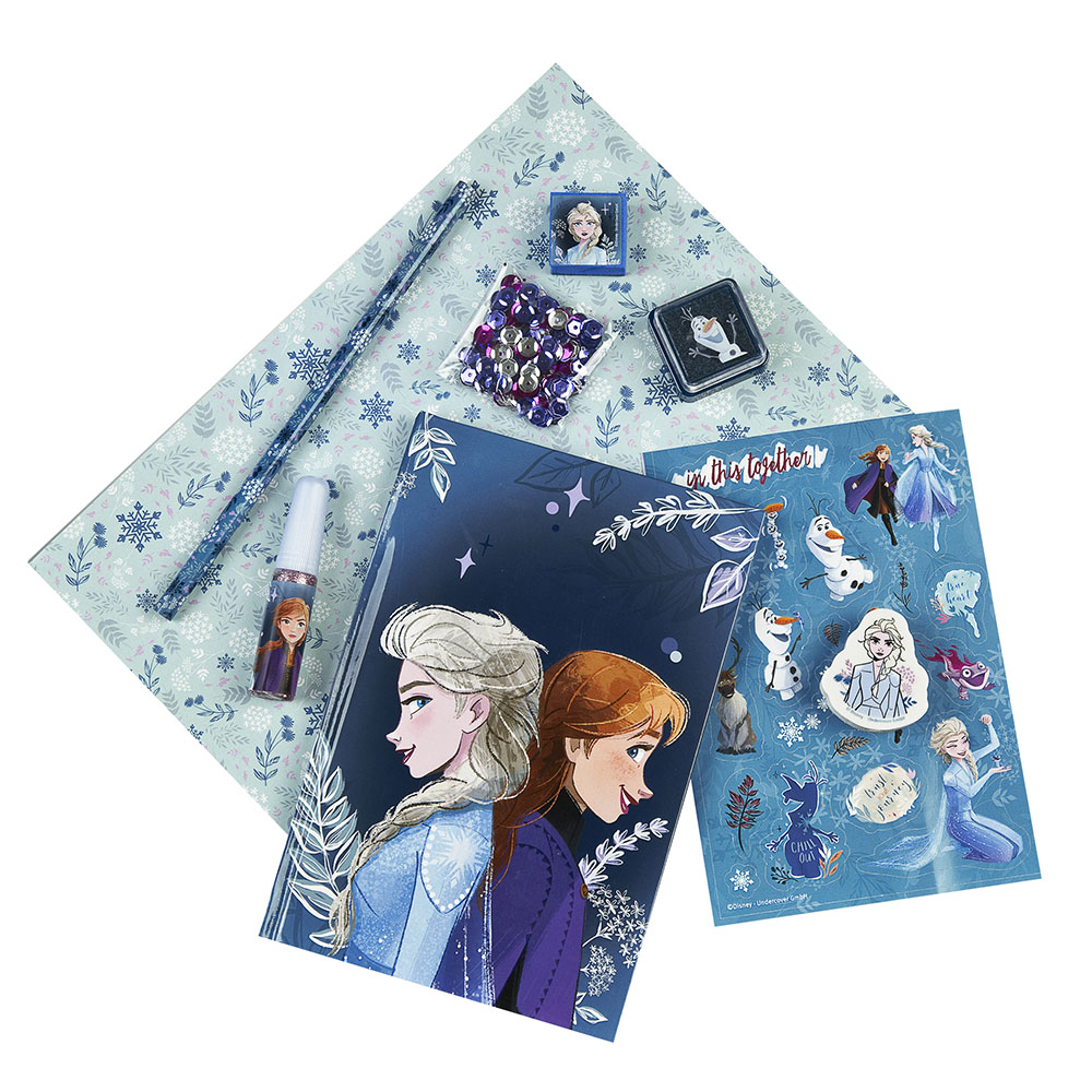 Notebook (12 x 18 cm) in Frozen motif, 60 pages with 1c print, sequins in 2 colors, glitter glue, stamp, stamp pad, pencil with eraser topper, sticker sheet.
