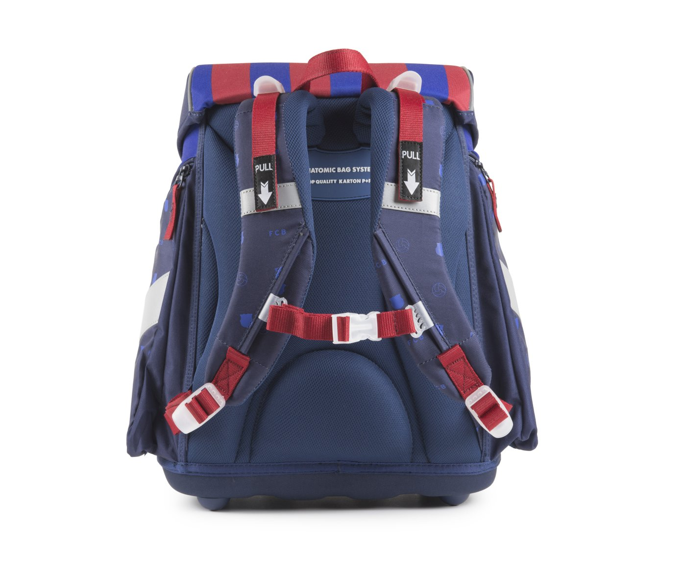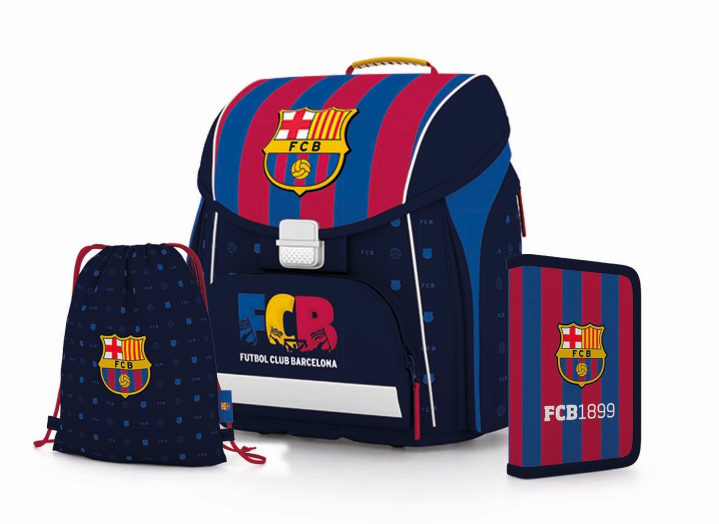 School set for first-grader with FC Barcelona theme. The set includes a Premium school bag, a gym bag and an unfilled one-story pencil case.