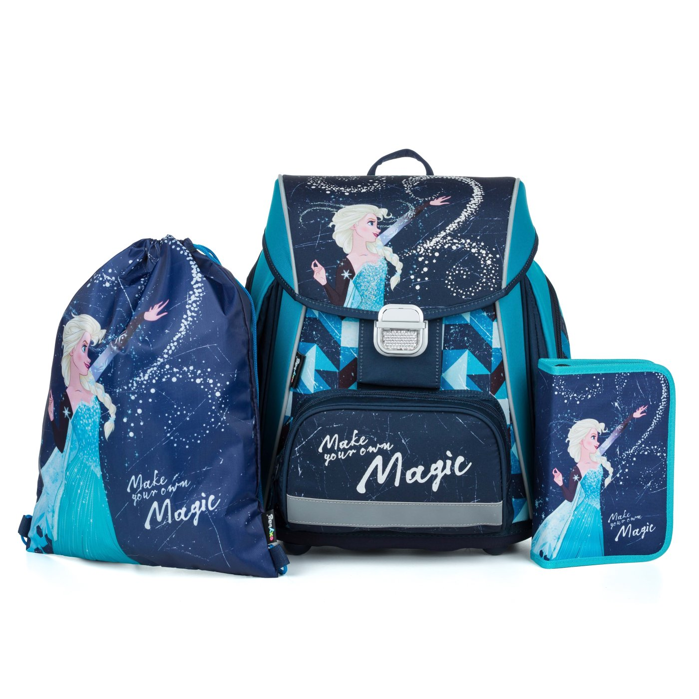 School set for first-grader with Frozen theme. The set includes a Premium school bag, a gym bag and an unfilled one-story pencil case.