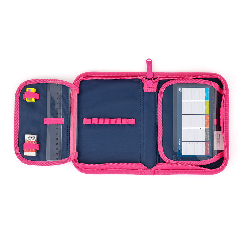 Penál: Jednopatrový školní penál se dvěma chlopněmi bez náplně. Gumová poutka k uchycení psacích potřeb. Na vnitřní chlopni je průhledná fólie pro rozvrh hodin.