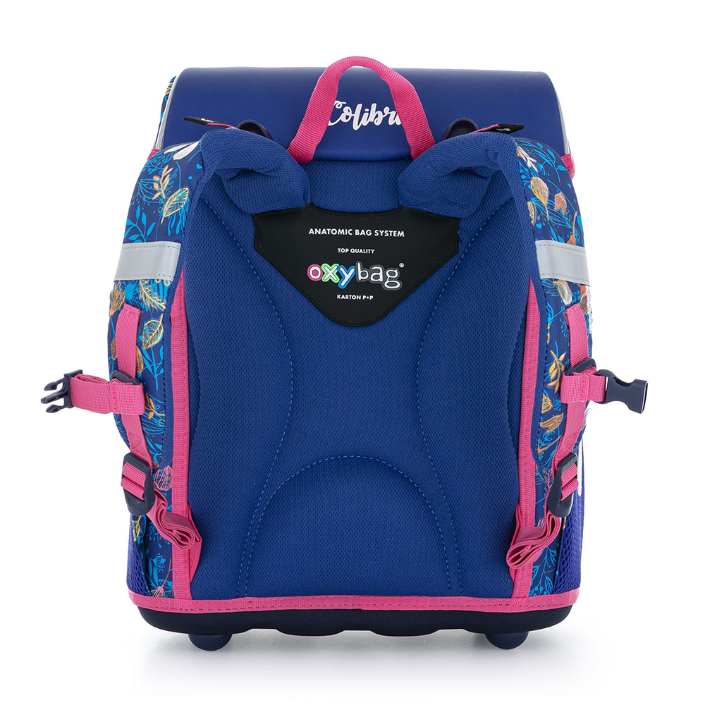 Aktovka: Školní aktovka z řady Premium s motivem kolibříka je anatomicky tvarovaná a zajišťuje tak správné usazení na zádech. Vyztužená záda a vnitřní výztuha udržují stálý tvar batohu. Polstrování je z příjemného prodyšného materiálu, široké měkčené popruhy jsou navrženy tak, aby dokonale přilnuly a rovnoměrně zatížily ramena dítěte. Aktovka se skládá z jedné prostorné komory, kam se pohodlně vejdou všechny školní pomůcky pro děti v 1. a ve 2. třídě. Dno batohu je z pevného materiálu, chrání tím obsah před převržením a vysypáním. Zapínání je na bezpečnostní přezku. Přední kapsička je určena na svačinu, nechybí řada reflexních prvků, díky kterým je aktovka viditelnější.