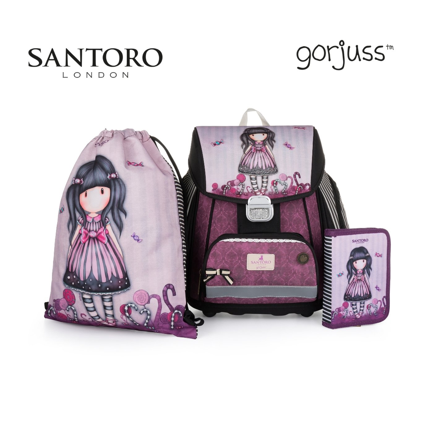 School set for first-grader with Sugar And Spice theme. The set includes a Premium school bag, a gym bag and an unfilled one-story pencil case.