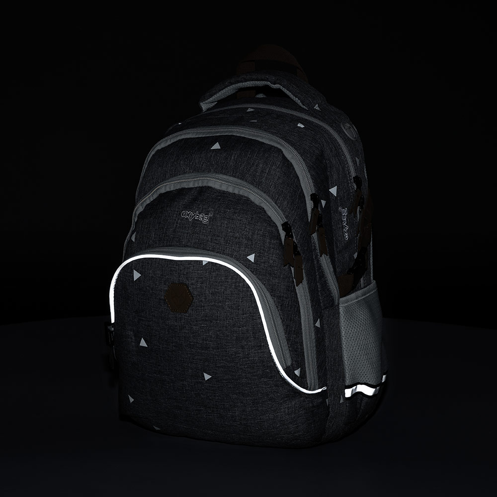 Oxy Scooler is a three-compartment backpack for pupils and students with a side bottle pocket, organizer, inner small pocket and also has a pocket for notebooks up to 15 ". Adjustable shoulder straps and chest strap together with anatomically shaped breathable back system for maximum wearing comfort. Of course, there are reflective elements.