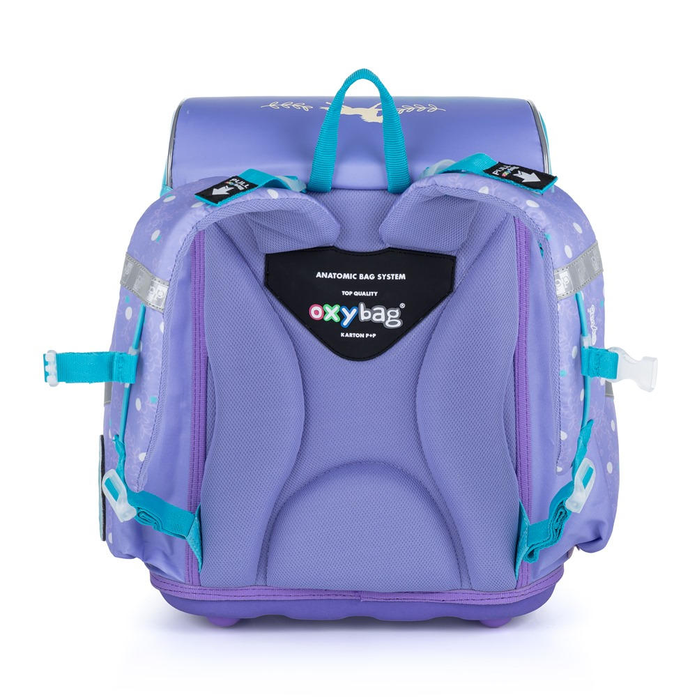 Premium backpack with horse motif is anatomically shaped to ensure proper seating on the back. Reinforced back and inner reinforcement keep the backpack in a constant shape. The padding is made of comfortable breathable material, the wide soft straps are designed to fit perfectly and evenly load the child´s shoulders. The bag consists of one spacious compartment, which can comfortably fit all school supplies for children in 1st and 2nd class. The bottom of the backpack is made of solid material, protecting the contents from tipping and spilling. Fastening is on the safety buckle. The front pocket is designed for a snack, there are many reflective elements that make the bag more visible.
