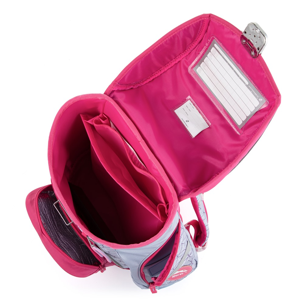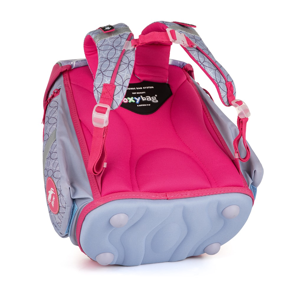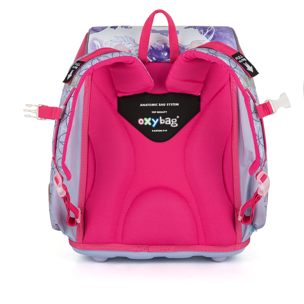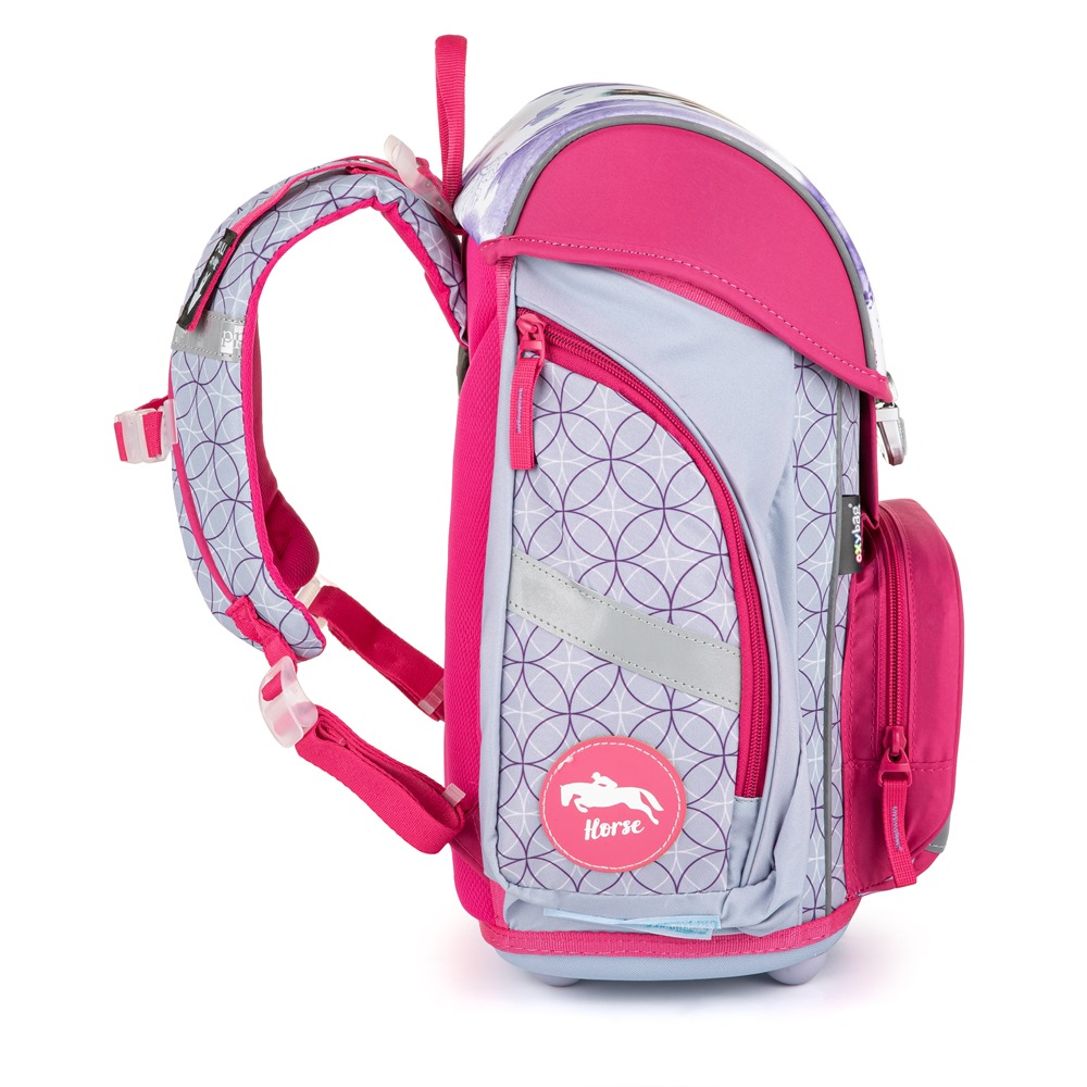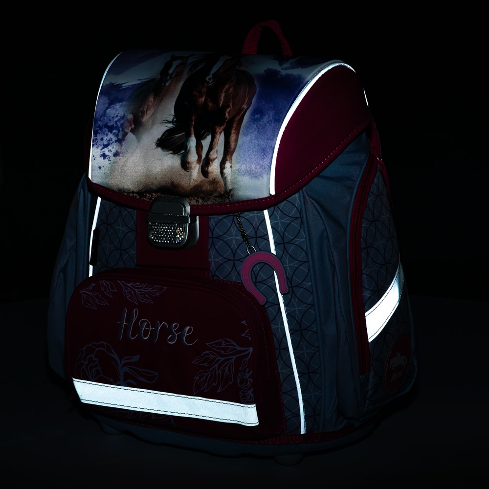 Premium backpack with horse motif is anatomically shaped to ensure proper seating on the back. Reinforced back and inner reinforcement keep the backpack in a constant shape. The padding is made of comfortable breathable material, the wide soft straps are designed to fit perfectly and evenly load the child´s shoulders. The bag consists of one spacious compartment, which can comfortably fit all school supplies for children in 1st and 2nd class. The bottom of the backpack is made of solid material, protecting the contents from tipping and spilling. Fastening is on the safety buckle. The front pocket is designed for a snack, there are many reflective elements that make the bag more visible.