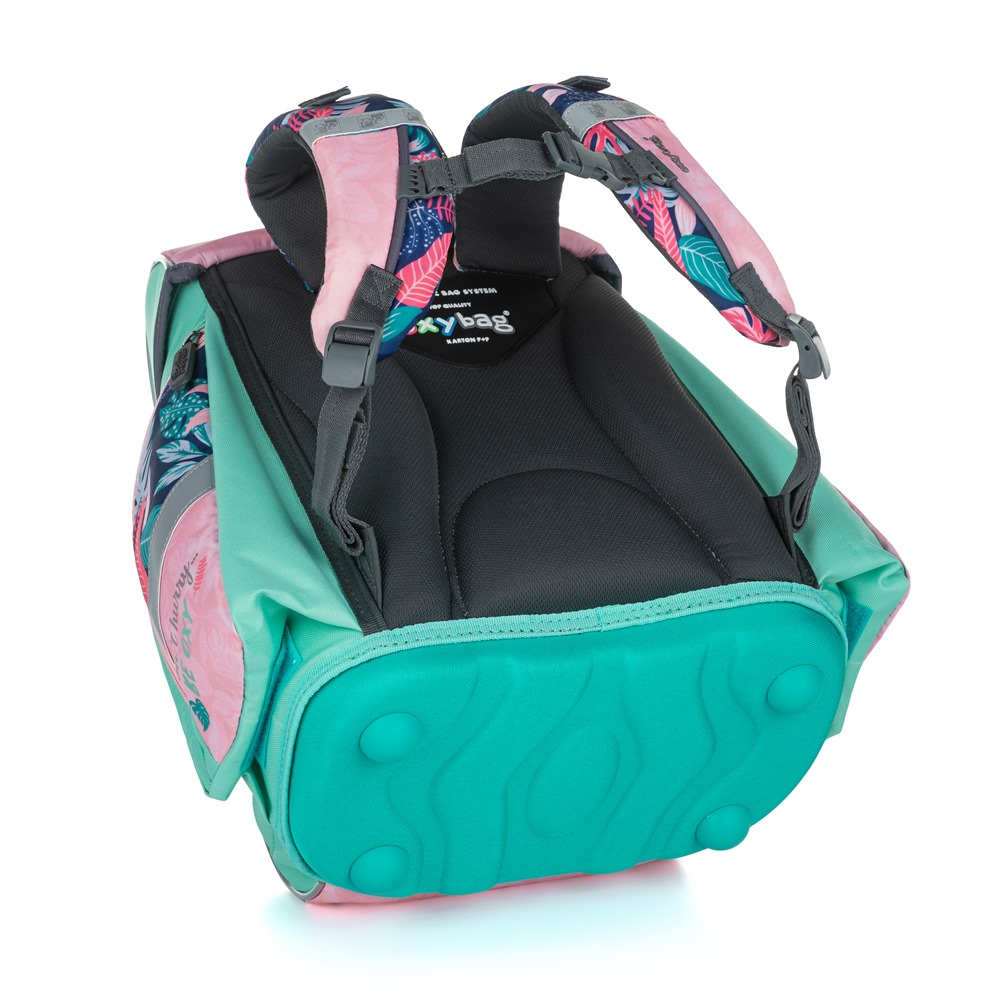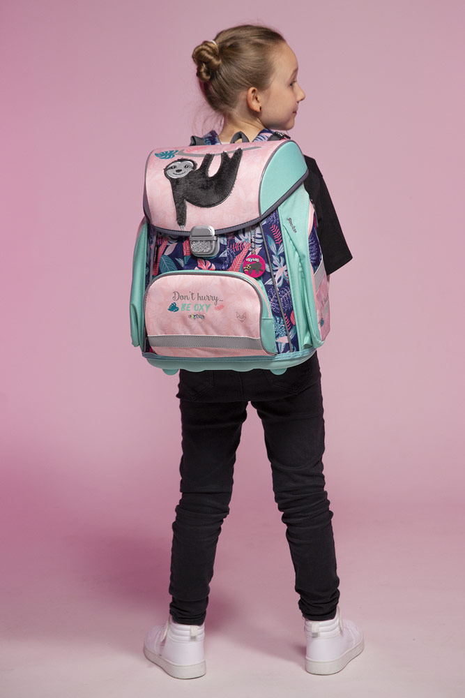 Premium backpack with Sloth motif is anatomically shaped to ensure proper seating on the back. Reinforced back and inner reinforcement keep the backpack in a constant shape. The padding is made of comfortable breathable material, the wide soft straps are designed to fit perfectly and evenly load the child´s shoulders. The bag consists of one spacious compartment, which can comfortably fit all school supplies for children in 1st and 2nd class. The bottom of the backpack is made of solid material, protecting the contents from tipping and spilling. Fastening is on the safety buckle. The front pocket is designed for a snack, there are many reflective elements that make the bag more visible.