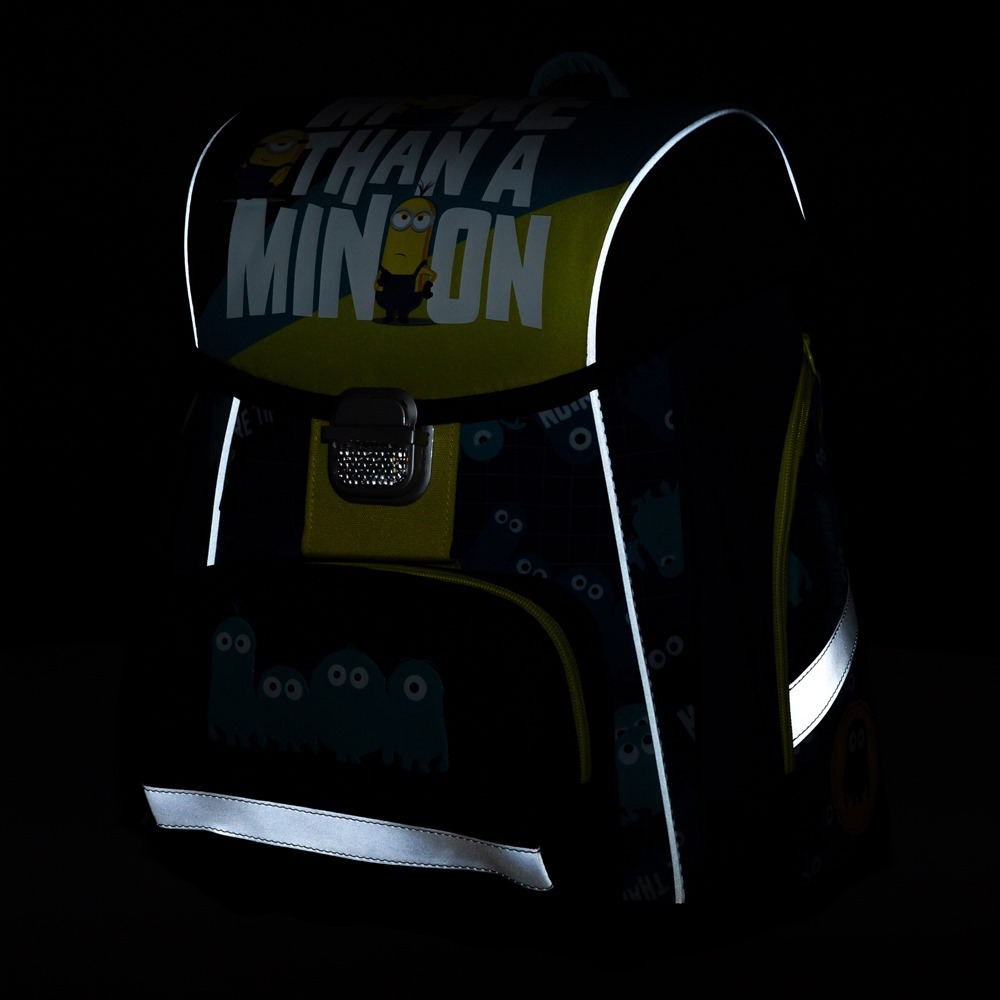 Premium backpack with Minions motif is anatomically shaped to ensure proper seating on the back. Reinforced back and inner reinforcement keep the backpack in a constant shape. The padding is made of comfortable breathable material, the wide soft straps are designed to fit perfectly and evenly load the child´s shoulders. The bag consists of one spacious compartment, which can comfortably fit all school supplies for children in 1st and 2nd class. The bottom of the backpack is made of solid material, protecting the contents from tipping and spilling. Fastening is on the safety buckle. The front pocket is designed for a snack, there are many reflective elements that make the bag more visible.