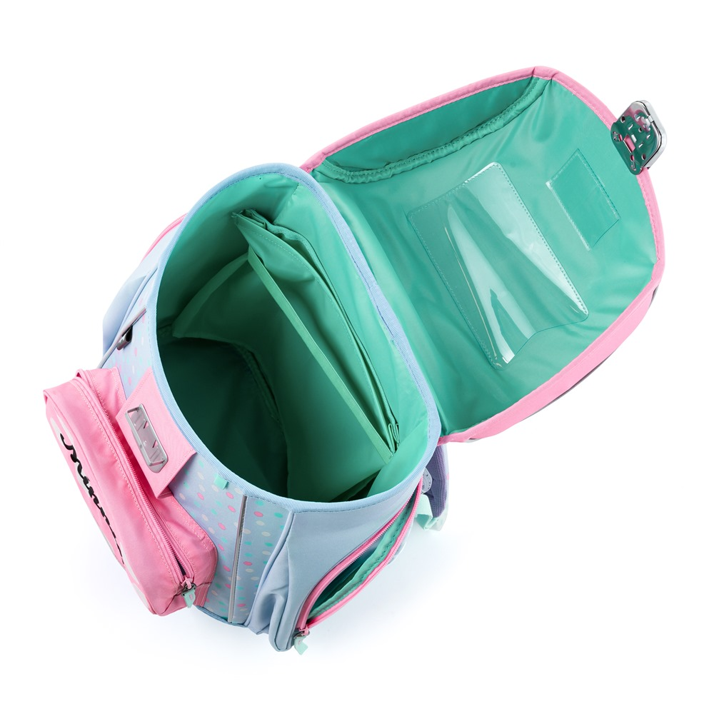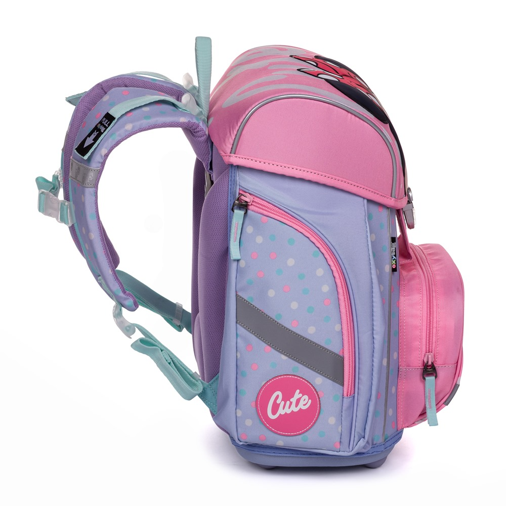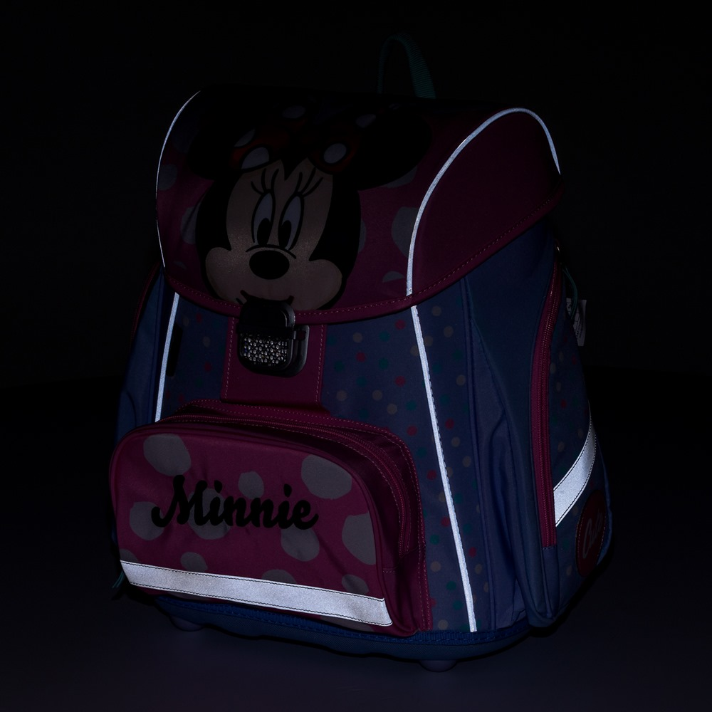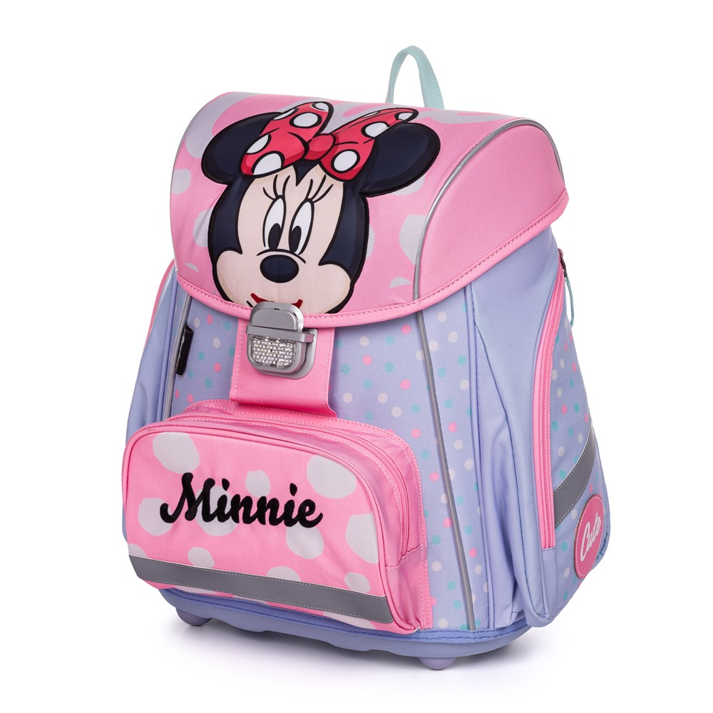 Premium backpack with Minnie motif is anatomically shaped to ensure proper seating on the back. Reinforced back and inner reinforcement keep the backpack in a constant shape. The padding is made of comfortable breathable material, the wide soft straps are designed to fit perfectly and evenly load the child´s shoulders. The bag consists of one spacious compartment, which can comfortably fit all school supplies for children in 1st and 2nd class. The bottom of the backpack is made of solid material, protecting the contents from tipping and spilling. Fastening is on the safety buckle. The front pocket is designed for a snack, there are many reflective elements that make the bag more visible.