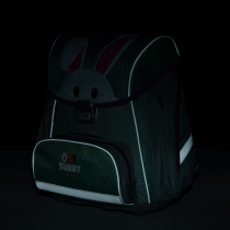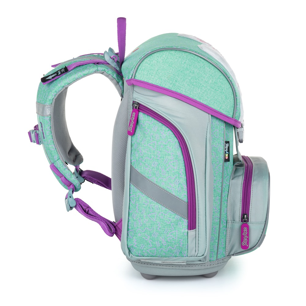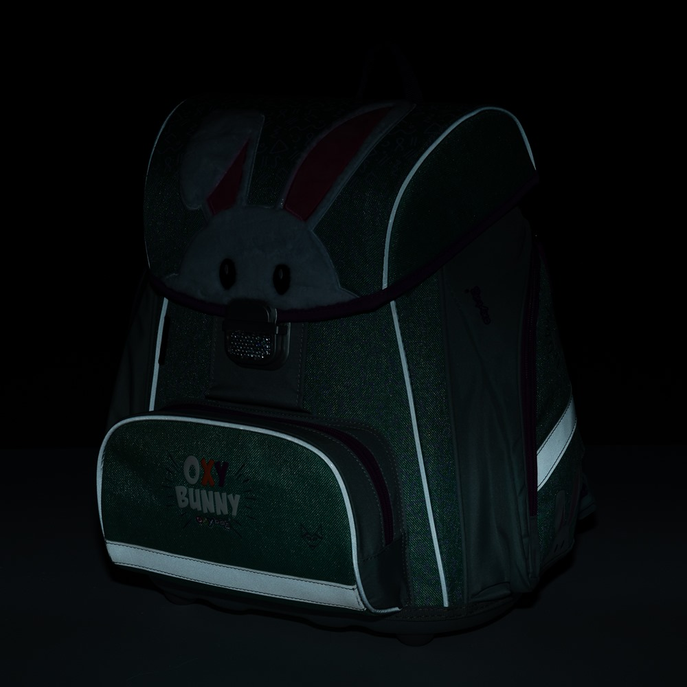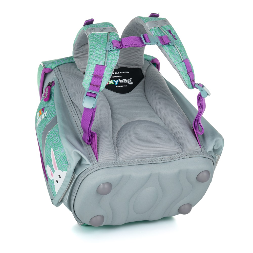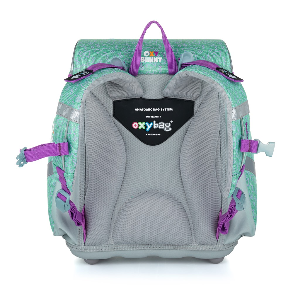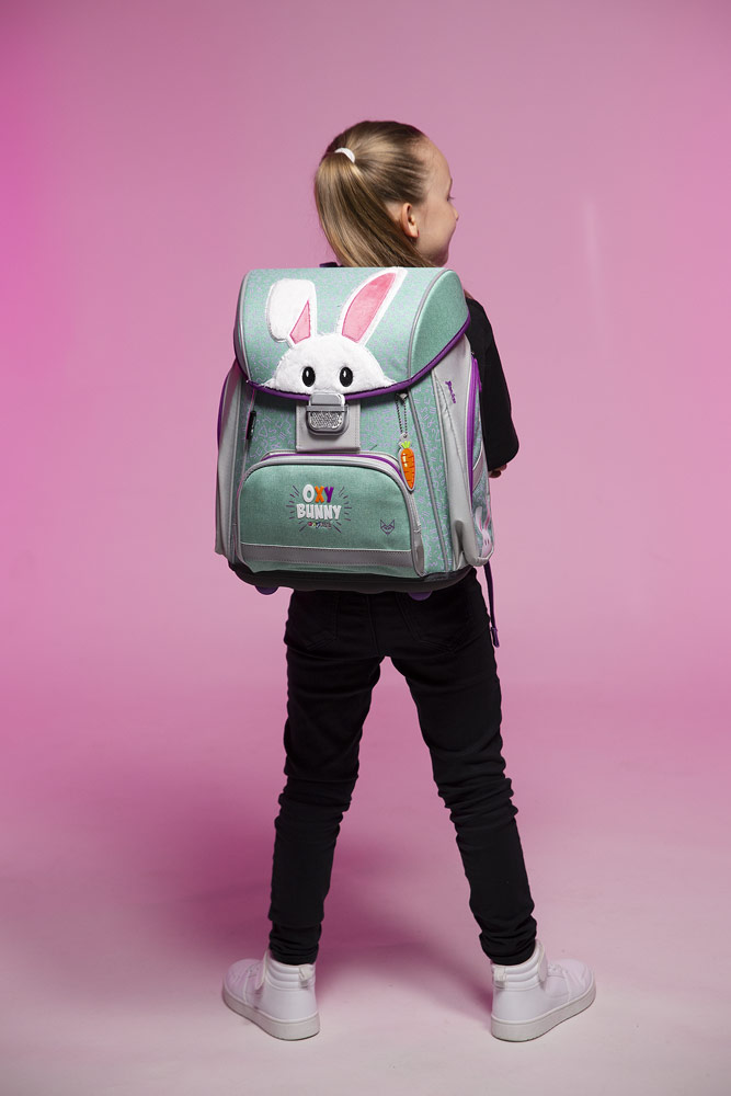 Premium backpack with Oxy Bunny motif is anatomically shaped to ensure proper seating on the back. Reinforced back and inner reinforcement keep the backpack in a constant shape. The padding is made of comfortable breathable material, the wide soft straps are designed to fit perfectly and evenly load the child´s shoulders. The bag consists of one spacious compartment, which can comfortably fit all school supplies for children in 1st and 2nd class. The bottom of the backpack is made of solid material, protecting the contents from tipping and spilling. Fastening is on the safety buckle. The front pocket is designed for a snack, there are many reflective elements that make the bag more visible.