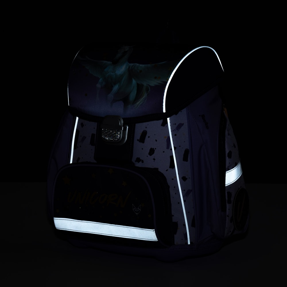Premium backpack with pegas motif is anatomically shaped to ensure proper seating on the back. Reinforced back and inner reinforcement keep the backpack in a constant shape. The padding is made of comfortable breathable material, the wide soft straps are designed to fit perfectly and evenly load the child´s shoulders. The bag consists of one spacious compartment, which can comfortably fit all school supplies for children in 1st and 2nd class. The bottom of the backpack is made of solid material, protecting the contents from tipping and spilling. Fastening is on the safety buckle. The front pocket is designed for a snack, there are many reflective elements that make the bag more visible.