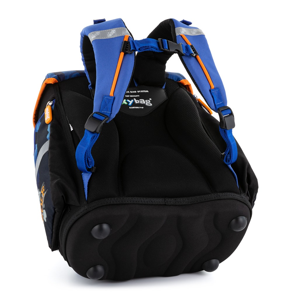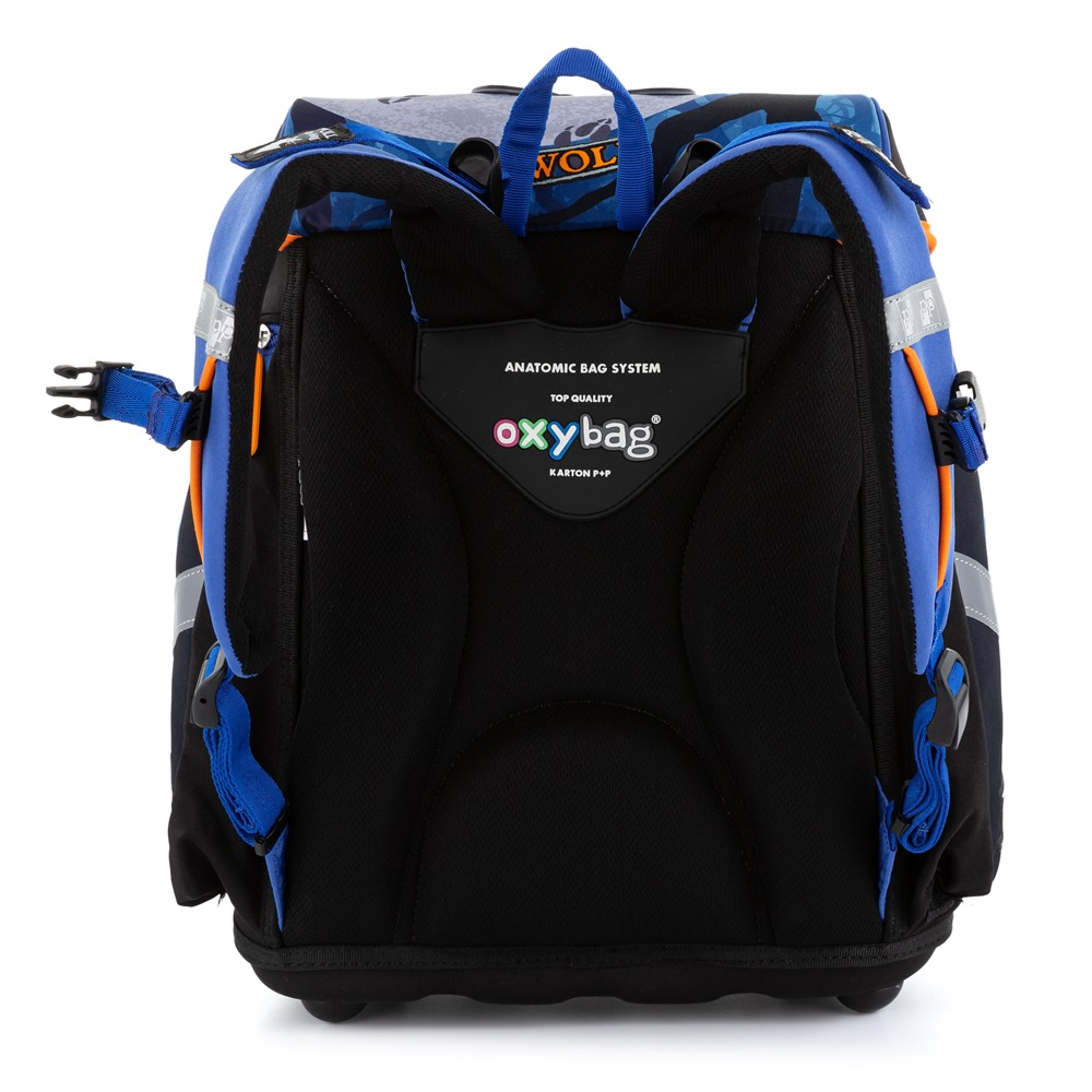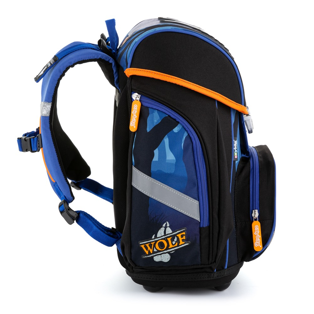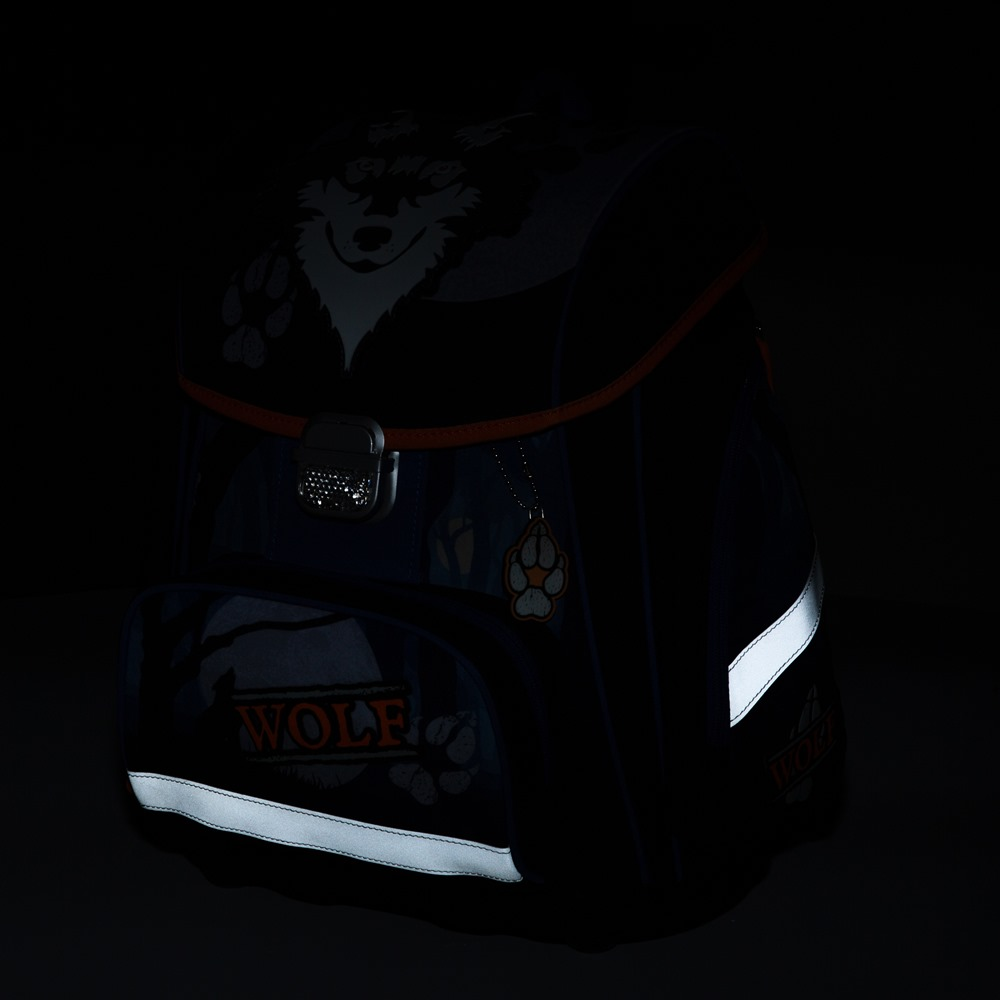 Premium backpack with wolf motif is anatomically shaped to ensure proper seating on the back. Reinforced back and inner reinforcement keep the backpack in a constant shape. The padding is made of comfortable breathable material, the wide soft straps are designed to fit perfectly and evenly load the child´s shoulders. The bag consists of one spacious compartment, which can comfortably fit all school supplies for children in 1st and 2nd class. The bottom of the backpack is made of solid material, protecting the contents from tipping and spilling. Fastening is on the safety buckle. The front pocket is designed for a snack, there are many reflective elements that make the bag more visible.