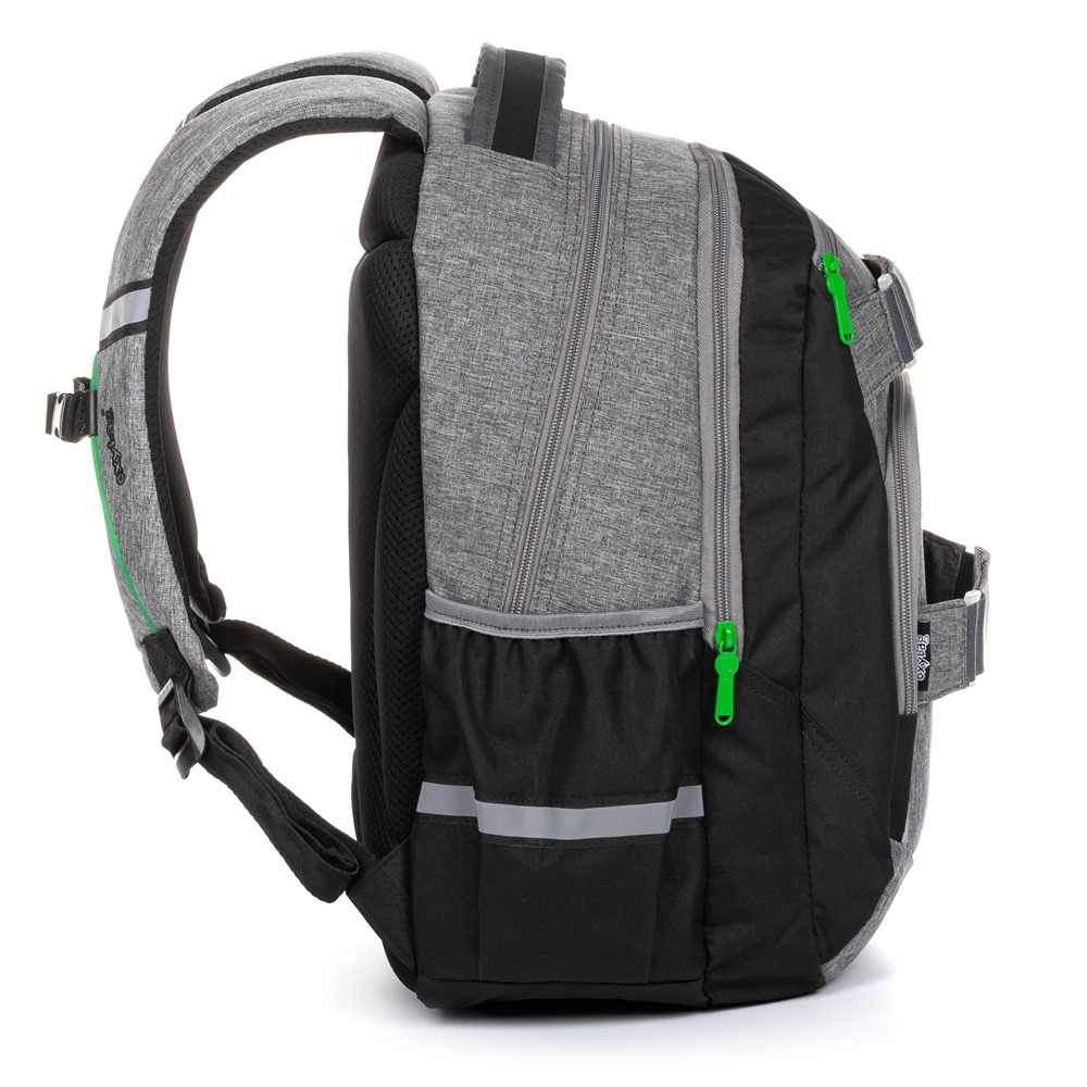 Školní batoh: z řady OXY STYLE na sebe jednoduše strhne pozornost. Je stylový, cool, prostě pecka. Hvězda ve své třídě a ideální parťák nejen do školy. Určitě oceníte jeho promyšlený vnější design: sympatický tvar, anatomicky tvarovaná a prodyšná záda, přední kapsu na zip i extra boční kapsy. Otevřená boční kapsa slouží na láhev, malá kapsička na zip z druhé strany ukryje telefon či klíče. Hravé rozmístění kontrastních detailů vás bude bavit. Ramenní popruhy a popruh na hrudi si můžete libovolně nastavit. Jeho vnitřní členění si zamilujete: 2 oddělené komory, praktická kapsa na notebook velikosti 15“, menší kapsa na tablet, nebo čtečku do velikosti 10“ a jako bonus menší kapsa s organizérem na různé školní drobnosti. Nepořádku, sbohem. Lehký jako pírko, prázdný neváží ani celé kilo. Přesto prostorný, pojme až 28 litrů věcí, bez nichž se zkrátka žádný teenager ve škole neobejde.