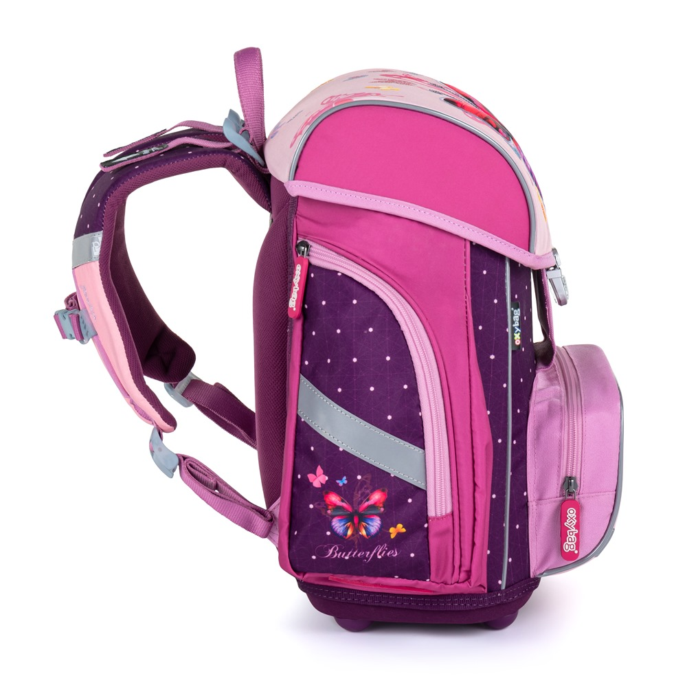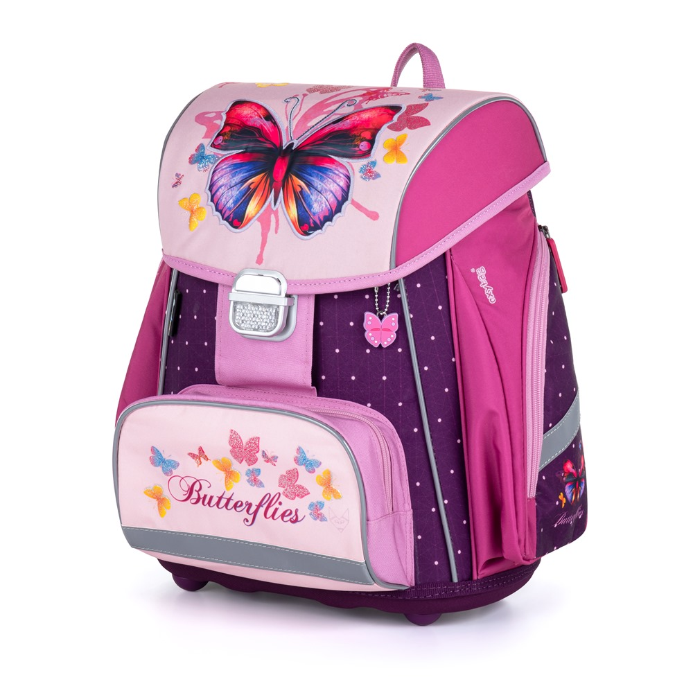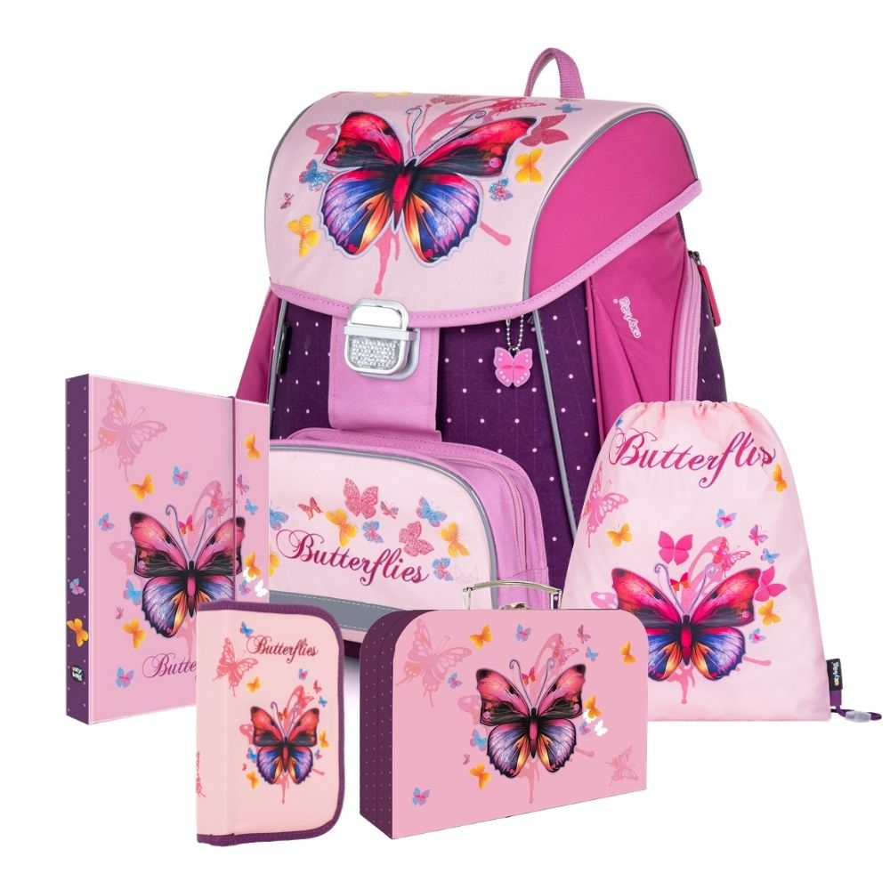 Školní set pro prvňáčka s motivem motýla. Set obsahuje školní batoh Premium, sáček na cvičky, prázdný jednopatrový penál, kufřík a box na sešity A4 Jumbo.