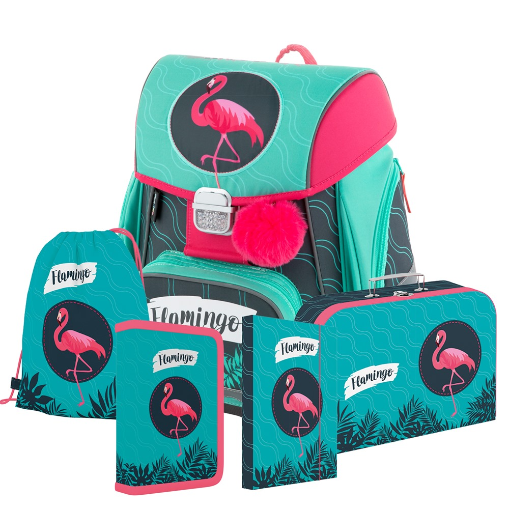 Školní set pro prvňáčka s motivem plameňáka. Set obsahuje školní batoh Premium, sáček na cvičky, naplněný jednopatrový penál, kufřík a box na sešity A4.