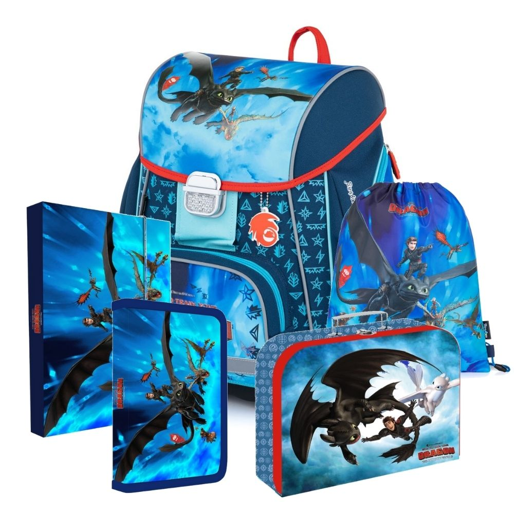 Školní set pro prvňáčka s motivem Jak vycvičit draka. Set obsahuje školní batoh Premium, sáček na cvičky, prázdný jednopatrový penál, kufřík a box na sešity A4.