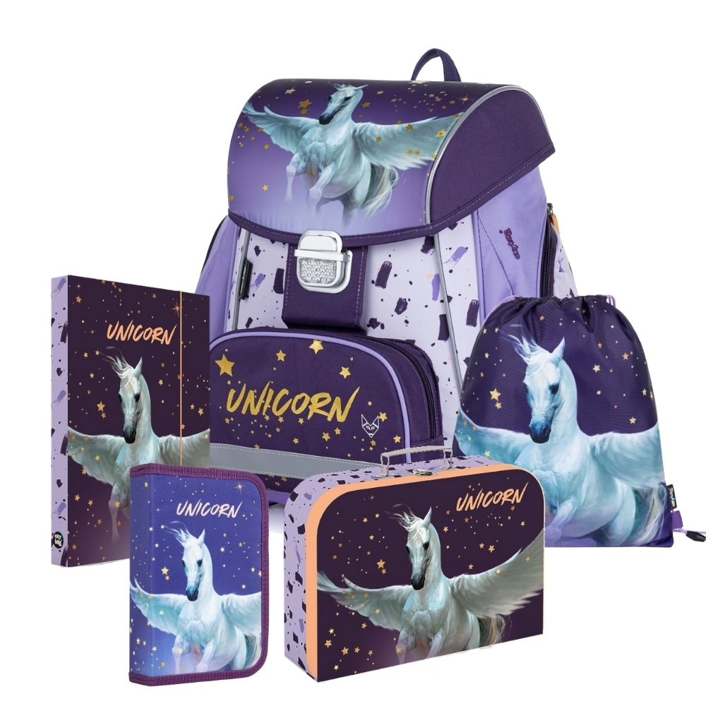 Školní set pro prvňáčka s motivem Pegase. Set obsahuje školní batoh Premium, sáček na cvičky, prázdný jednopatrový penál, kufřík a box na sešity A4 Jumbo.
